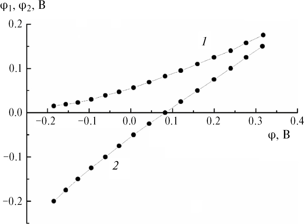 Рис. 7. Зависимости потенциалов φ1 (1) и φ2(2) от суммарного скачка потенциала φ.