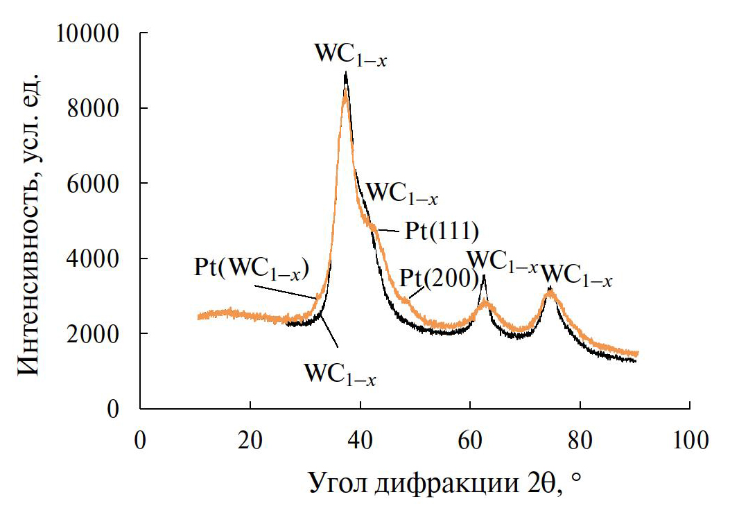 Появление фазы платины заметно на дифрактограммах полученных электродов (рис. 1), однако ее рефлексы обладают малой интенсивностью по сравнению с рефлексами карбидов вольфрама, что делает невозможным количественную обработку дифрактограмм. Также можно отметить уширение рефлексов карбидов вольфрама при 2θ = 62.3° и 74.6°, которое, по-видимому, связано с частичным окислением частиц WC1–x, сопровождающимся уменьшением их размеров и уширением рефлексов.