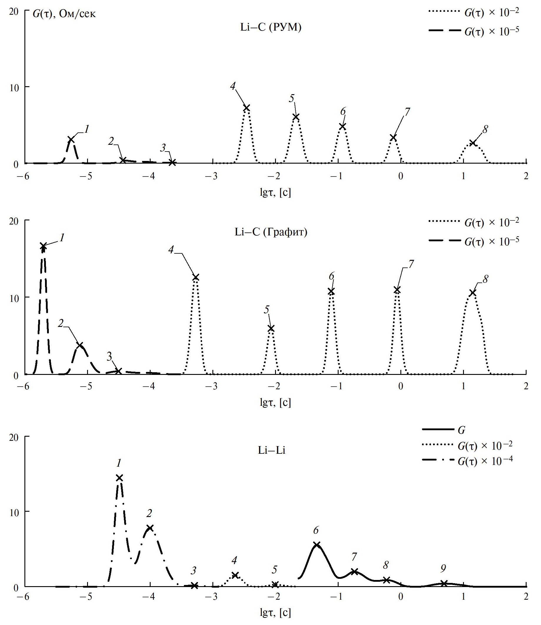 Пики, соответствующие высокочастотной области (τ < 10–4.5 с) присутствуют на графиках функций DRT только литий-углеродных ячеек. Вероятнее всего это импеданс границ (SEI) между углеродными частицами и импеданс границы углерод/токовый коллектор.