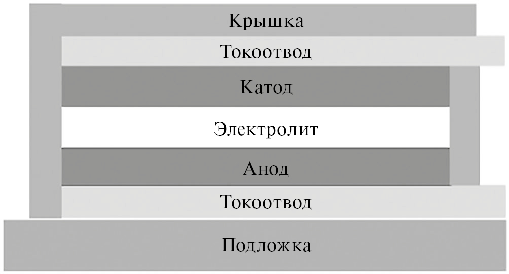 Рис. 1. Схема полностью твердотельного тонкопленочного литий-ионного аккумулятора.