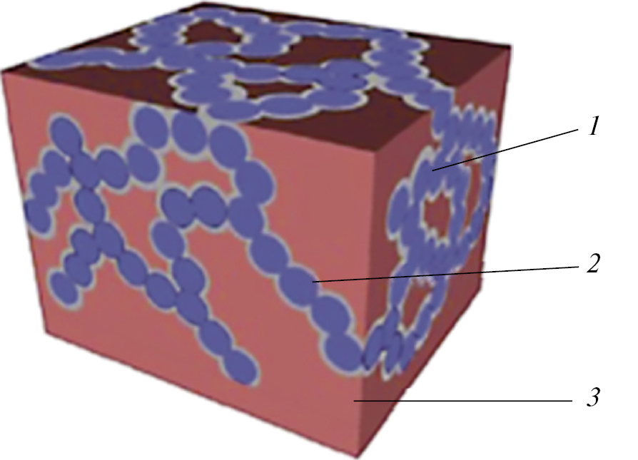 Рис. 3. “Губчатая” конструкция 3D-аккумулятора. 1 – активный материал положительного электрода, 2 – электролит, 3 – активный материал отрицательного электрода (из [24], open access).