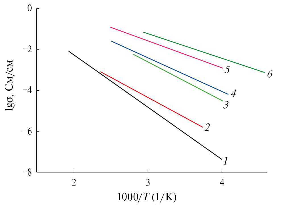 Рис. 4. Температурная зависимость удельной проводимости твердых электролитов. 1 – LiPON, 2 – Li3.6Si0.6P0.4O4, 3 – Li0.5La0.5TiO3, 4 – стеклокерамический Li7P3S11, 5 – Li10GeP2S12, 6 – Li9.54Si1.74P1.44S11.7Cl0.3.