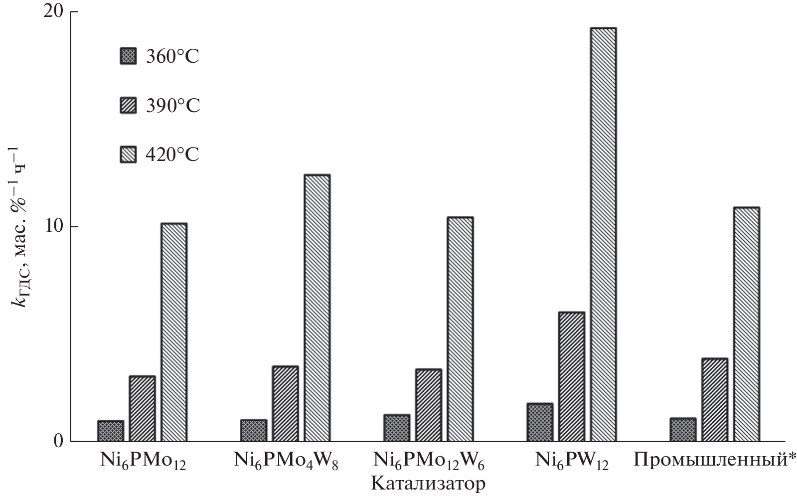 Kinetic studies of hydrodesulfurization and hydrodenitrogenation reactions were carried out, as well as a comparison of the hydrogenating activity of the synthesized Ni6PMonW(12 – n)/Al2O3 catalysts and an industrial reference catalyst in the process of hydrotreating of heavy mixed oil feedstock. As it was shown, the HDS reaction is described by a pseudosecond order equation, while the HDN reaction is described by a pseudofirst order. The obtained hydrogenates meet the requirements for the quality of feedstock of catalytic cracking plants in terms of coking capacity, sulfur and nitrogen content.
