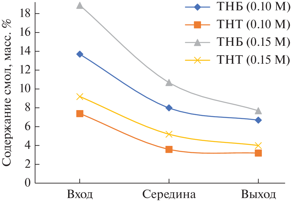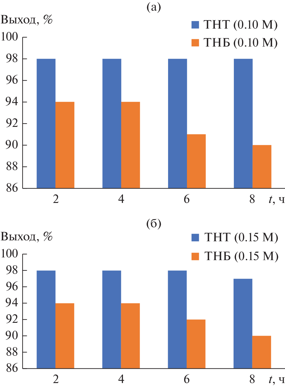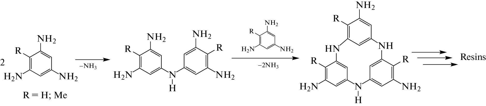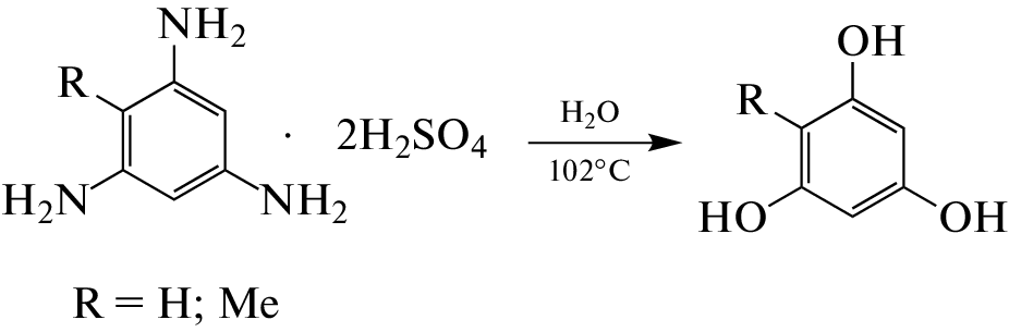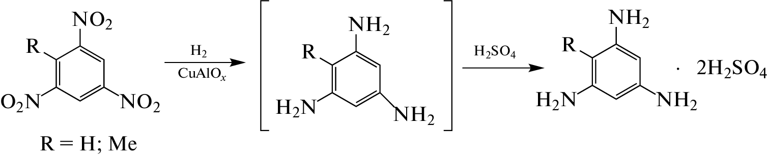 The catalytic properties of a copper-aluminum oxide catalyst obtained from double layered hydroxide have been studied in hydrogenation of 1,3,5-trinitrobenzene (TNB) and 2,4,6-trinitrotoluene (TNT) in a flow reactor. The reaction was carried out at temperature of 120°C, total pressure of 30 bar and substrate concentration of 0.10–0.15 M, using methanol as a solvent. 1,3,5-Triaminobenzene (TAB) and 2,4,6-triaminotoluene (TAT) were isolated from the reaction mixture in the form of double salts with sulfuric acid TAB⋅2H2SO4 and TAT⋅2H2SO4, the yield of which was 92 and 98%, respectively. At an initial trinitroarene concentration of 0.10 M, the hydrolysis of triaminobenzene salts made it possible to synthesize phloroglucinol and methylphloroglucinol in 78 and 91% yields. Increasing the concentration to 0.15 M reduces the yield to 71 and 88%, respectively. According to thermal analysis data, the observed differences in the yields of triaminobenzene salts and polyphenols are explained by the formation of different amounts of resinous by-products on the catalyst surface during hydrogenation of trinitroarene. Hydrogenation of TNT produces less resin, resulting in higher yields of TAT⋅2H2SO4 and methyl phloroglucinol. This is probably due to the presence of an electron-donating methyl substituent, which slows down polycondensation of TAT molecules.