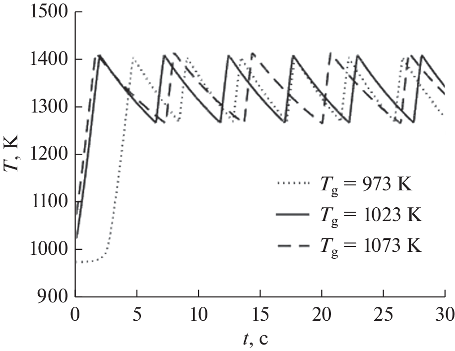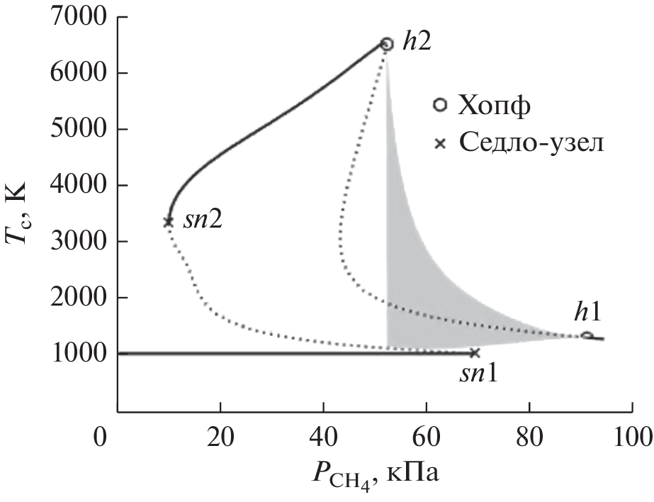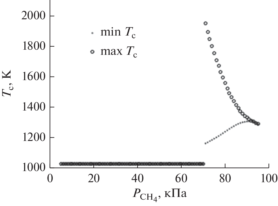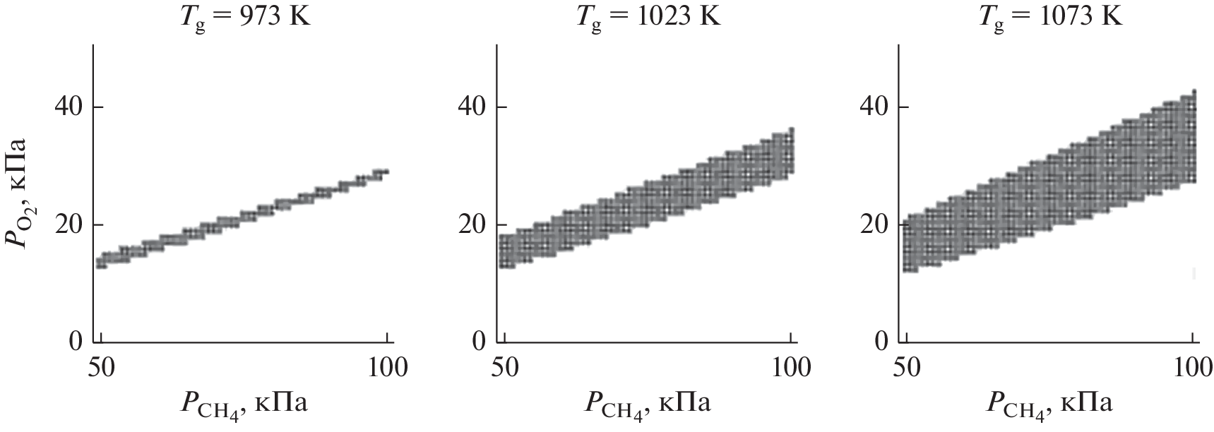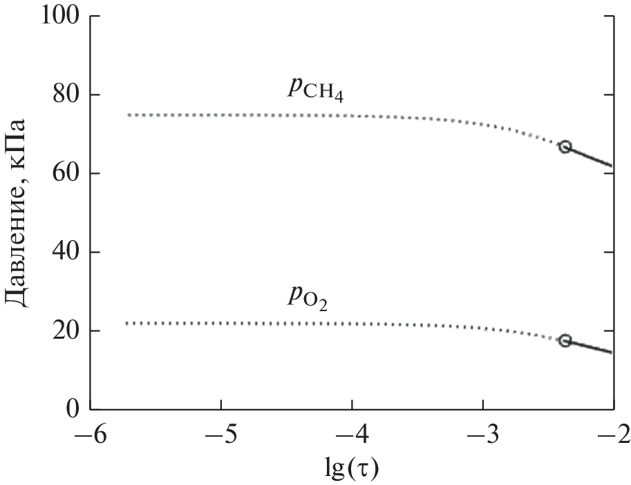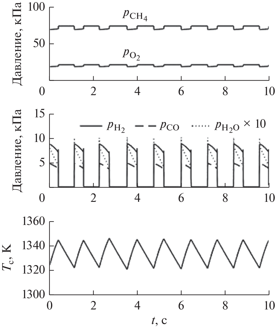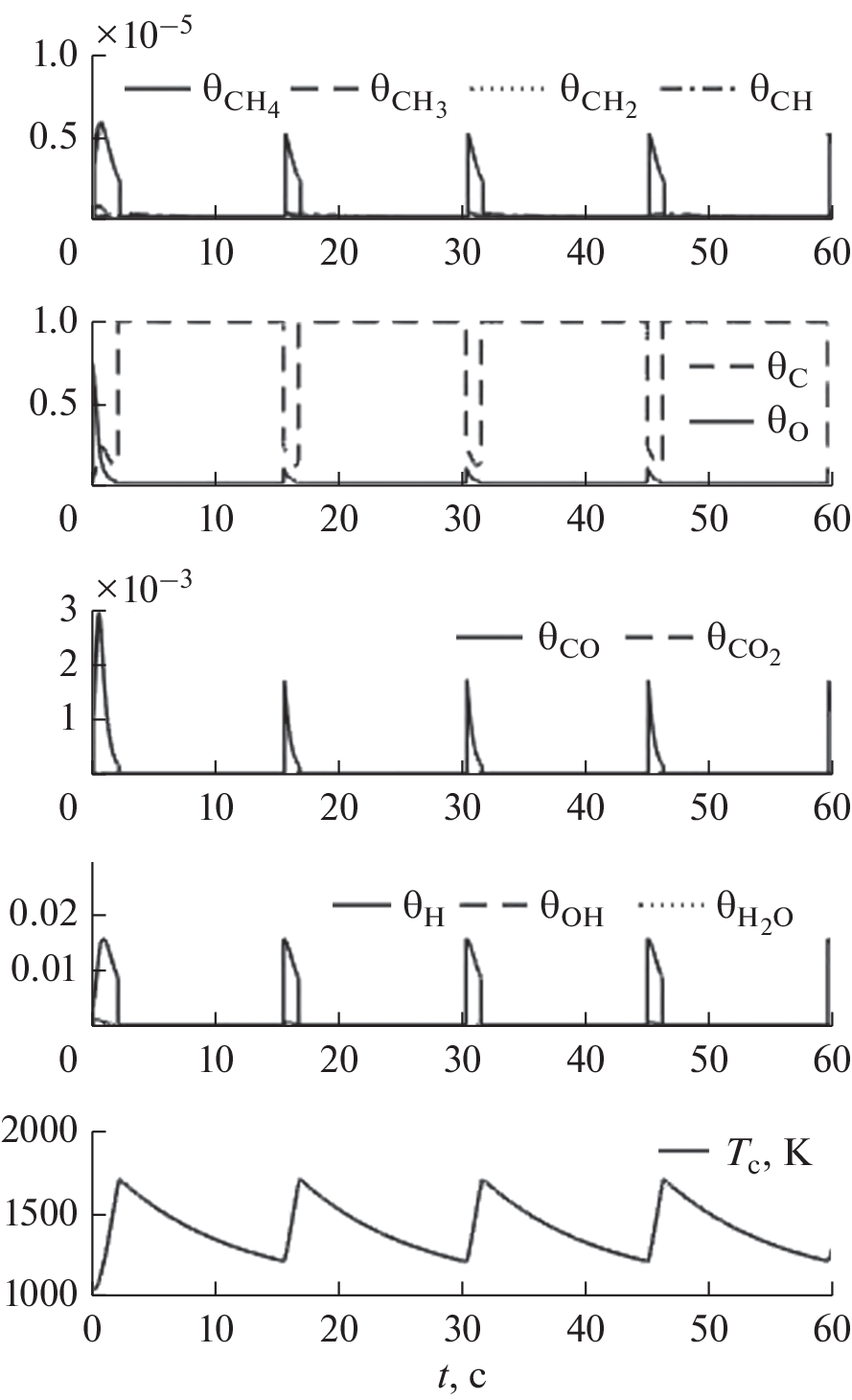 The paper demonstrates the possibility of occurrence of thermokinetic oscillations during the methane oxidation on a nickel industrial catalyst at real values of the parameters. It is shown that reaction rate oscillations can originate under the conditions of short contact times and in the region where periodic oxidation–reduction processes do not occur. The origin of these thermokinetic oscillations is the periodic blocking of the surface with carbon and its cleaning by removing carbon from the catalyst surface.