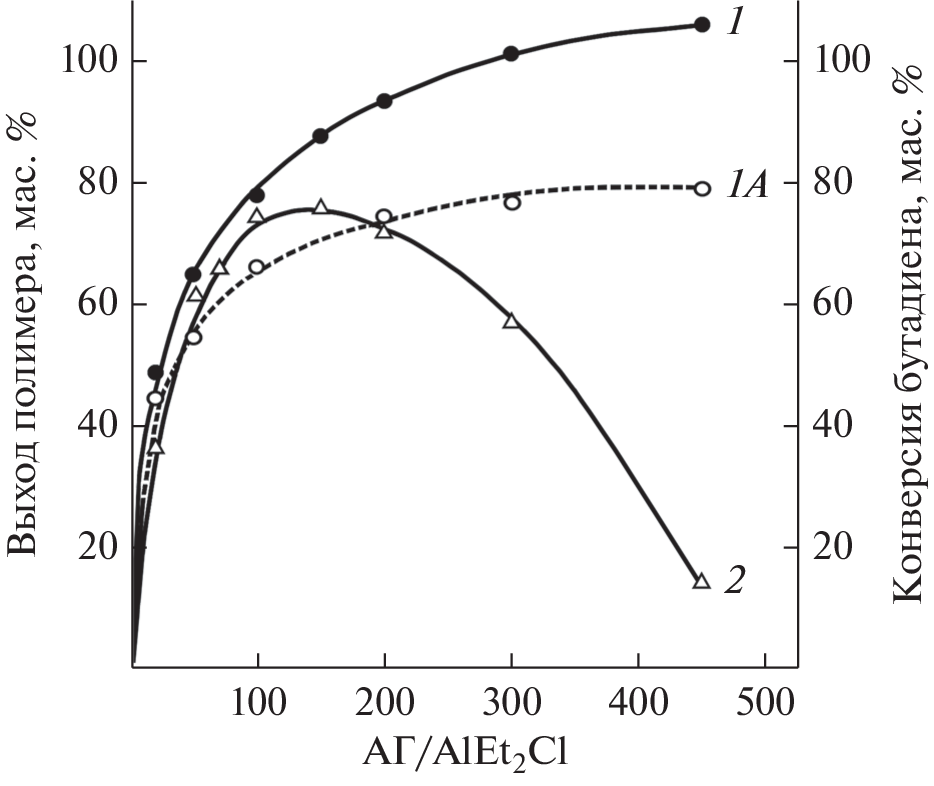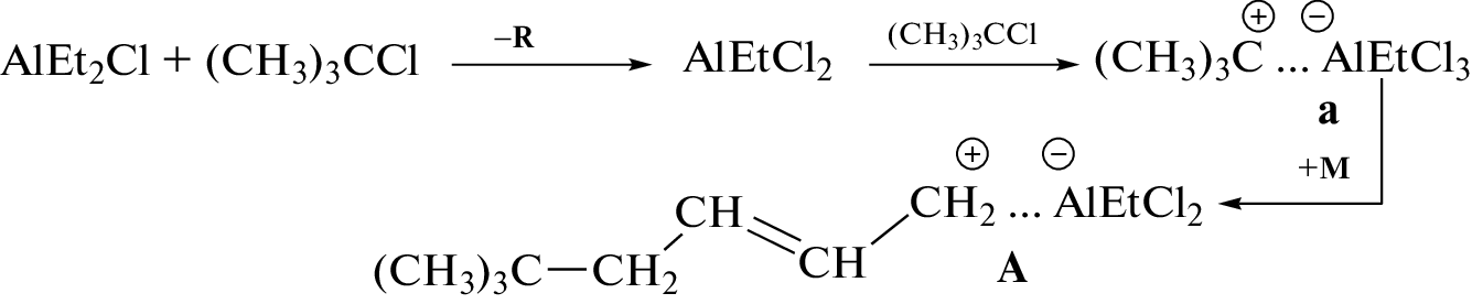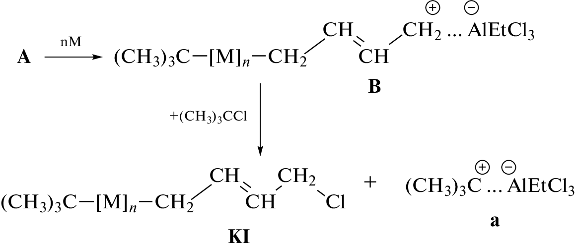 Сationic polymerization of butadiene with the catalytic systems based on diethylaluminium chloride (AlEt2Cl) in combination with tertiary alkyl halides (AH), such as tert-butyl chloride, tert-butyl bromide and 2-chloro-2-methylbutane, is an effective method for obtaining fully soluble butadiene polymers at a industrially relevant temperature of 20°C. It is shown that, regardless of the nature of AH in the catalytic system, with an increase in the duration of the polymerization process of butadiene, the values of the weight-average molecular weight and polydispersity of the polymers significantly increase with the simultaneous decrease of polybutadiene unsaturation, which is associated with the transfer reaction of the growing chain to the polymer double bond during polymerization. Using the 13C NMR spectroscopy method, it was found that polybutadiene macromolecules synthesized on the AlEt2Cl–tert-butyl chloride catalytic system consist mainly of 1,4-trans units, contain two types of initial tert-butyl units and two types of end chlorine-containing units formed as a result of the transfer reaction of the growing chain to tert-butyl chloride. Based on the data of 13C NMR spectra of polybutadiene, a method for calculating the conversion of butadiene during polymerization has been developed, and a mechanism of the process of cationic butadiene polymerization has been proposed. It is shown that the synthesized “cationic” polybutadiene is characterized by high film-forming properties and can be a promising component in the production of paint and varnish materials.