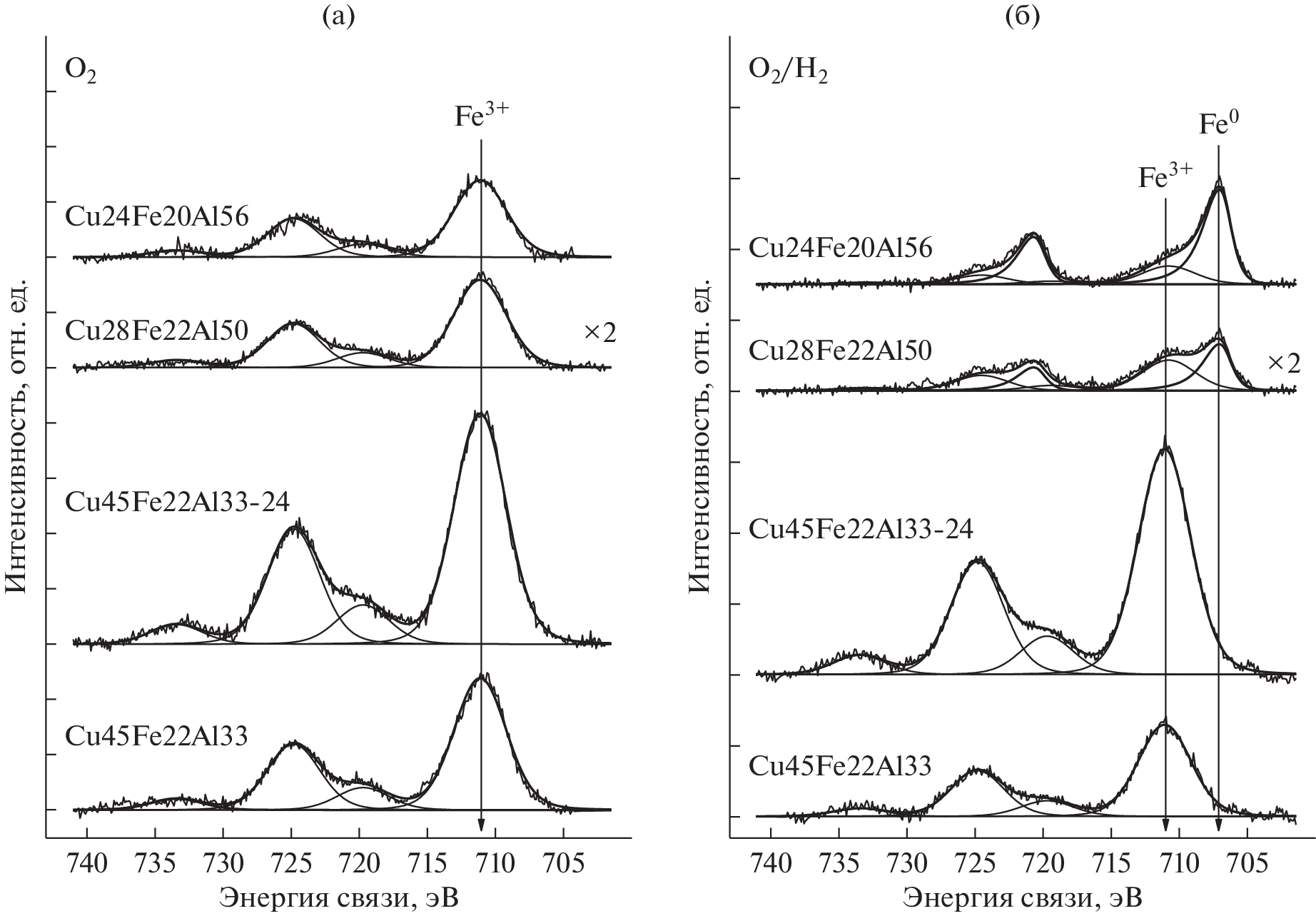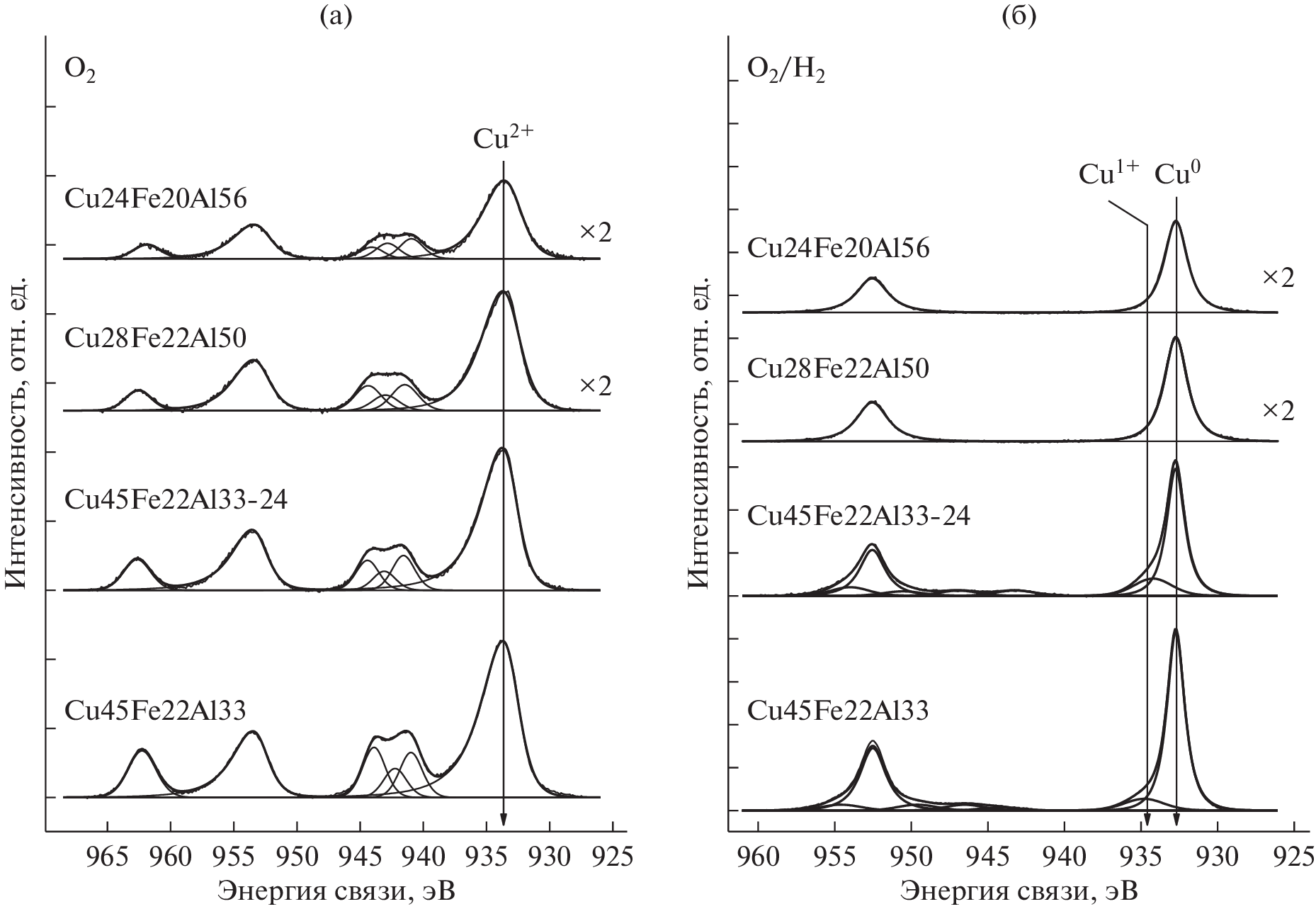 Керамометаллические катализаторы CuFeAlO/CuFeAl, полученные из различных порошкообразных прекурсоров Cu–Fe–Al, отличающихся стехиометрией и способом приготовления, охарактеризованы физико-химическими методами и исследованы в реакции паровой конверсии СО (СО + + Н2О ⇌ СО2 + Н2). Катализаторы представляют собой единый пористый композит, в котором металлические частицы покрыты оксидной оболочкой. Показано, что наиболее стабилен образец со стехиометрией Cu : Fe : Al = 45 : 22 : 33 ат. %, синтезированный из порошкообразного прекурсора в две стадии. На первой стадии проводили механохимическое сплавление порошков железа и меди, а на второй – механохимическую обработку полученного продукта, смешанного с алюминием. Это позволило обеспечить более равномерное распределение компонентов в прекурсоре. Методами рентгеновской дифракции, сканирующей электронной микроскопии и рентгеновской фотоэлектронной спектроскопии исследованы образцы керамометаллических катализаторов до и после реакции при 400°С. Выявлено, что наиболее активные при 350°С катализаторы имеют после обработки в восстановительной среде восстановленные центры Cu1+ и Fe3+. Наименее активные катализаторы восстанавливаются полностью до Cu0 и частично до Fe0. Обнаружено что активность в области температур 330–400°С определяется не только железными, но и медными активными центрами на поверхности катализаторов или их совместным действием. Двухстадийная мехактивация, по-видимому, приводит к более глубокому химическому взаимодействию компонентов – Fe и Cu, что обеспечивает более высокую активность бесхромовых CuFeAl керамометаллических катализаторов.