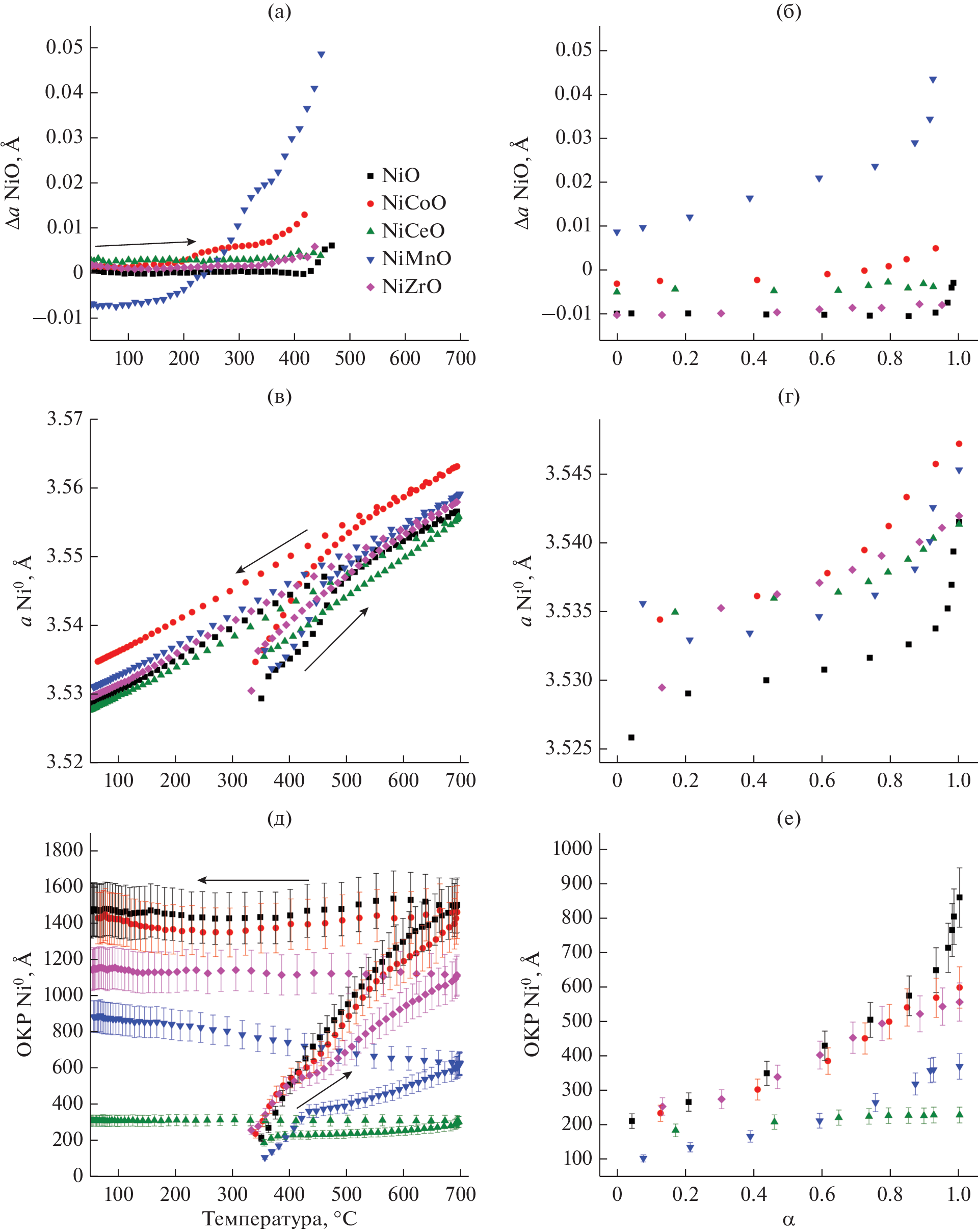 In this work the activation process and the effect of modifying additives on the phase composition and structure of a series of catalysts with the general composition Ni0.9M0.1O (M = Co, Ce, Mn, Zr) synthesized by co-precipitation were studied. The influence of the additives on the initial state of the samples was investigated by XRD, and their influence on the NiO reduction process was studied by in situ XRD and TPR-H2. It was shown that the introduced modifiers influence on the structure and microstructure of the initial samples, increasing the value of the specific surface and decreasing the average size of NiO CSR. Introduction of Mn, Co leads to formation with NiO oxide of solid solutions of replacement. For Ce and Zr the release of CeO2 oxide and X-Ray-amorphous ZrOx is observed. The use of these additives leads to an increase in the temperature of NiO reduction to the metallic state compared to the massive oxide. In addition, the effect of modifying additives on the particle size of the final metal is observed. The introduction of Ce and Mn decreases the average size of the NiO CSR in 2–5 times compared to the massive NiO.