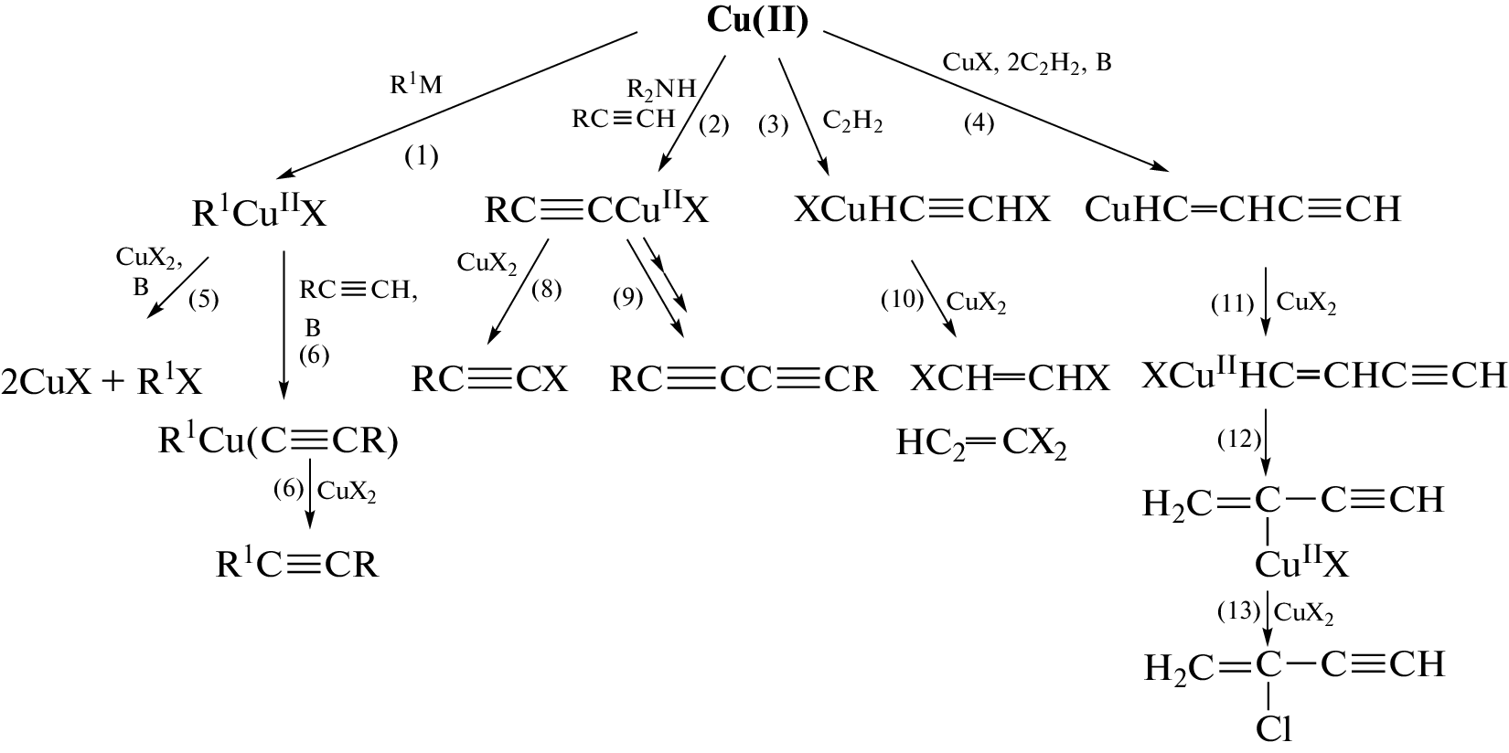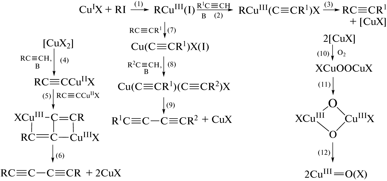 The methods of carrying out the coupling reactions in the alkynes chemistry were analyzed and generolyzed. Formation of C–C bonds in the reactions of oxidative dehydrocondensation, Kadio–Chodkevich and Sonogashira were considered. The protocols of these reactions were presented. The accent was made on the results of kinetic and spectrometric investigations of coupling reaction mechanisms with participation of Cu(I, II, III), Au(I, III), Pd(O, I, II), and Fe(O, I, II, III) complexes. The special attention was payed to heterogeneous catalysis of oxidative reactions of alkynes with participation of nanoparticles and nanoclusters of Pd, Au, Ag and other metals. The nature of intermediates with the complexes of Cu, Au, Pd and Fe and mutuality of different oxidative and nonoxidative transformations of alkynes were discussed.