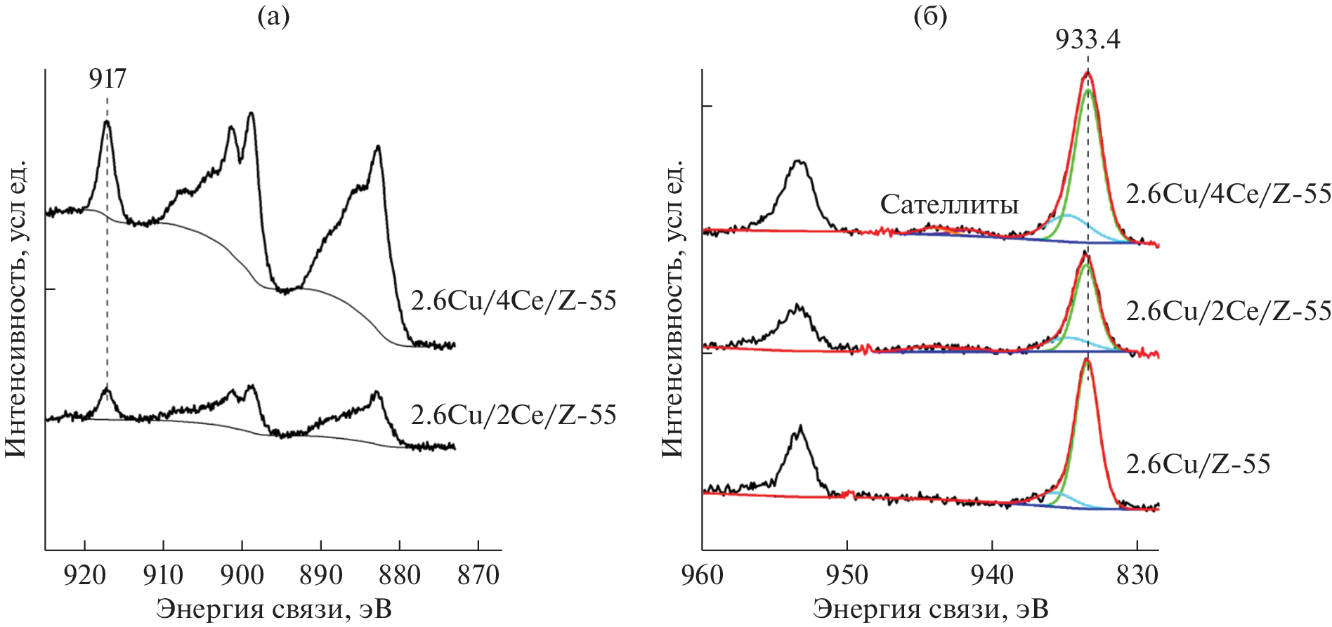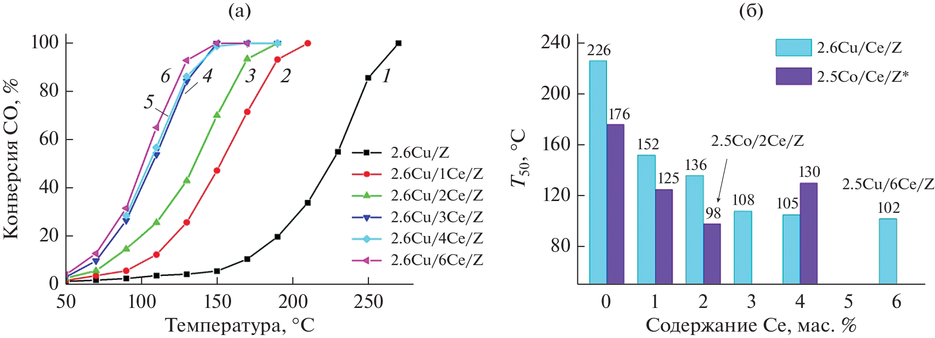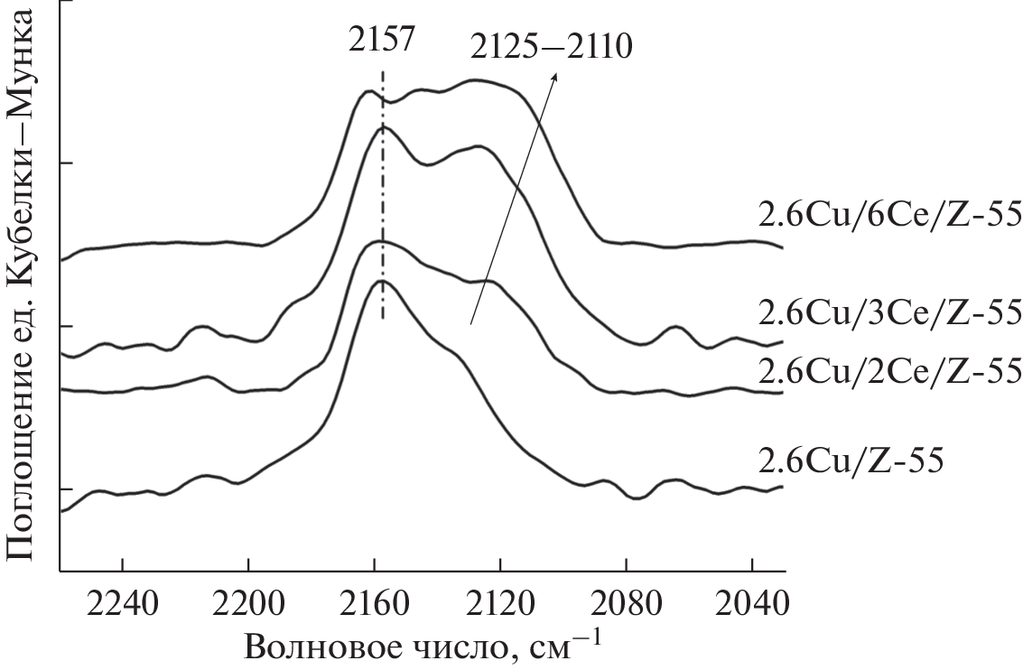 A series of mono- and bimetallic copper-cerium catalysts based on ZSM-5 zeolite with different aluminium content (SiO2/Al2O3 = 30 and 55) was synthesised by incipient wetness impregnation. The copper content was 0–4.3 wt %, and cerium loading varied in the range from 0 to 6 wt %. The obtained composites have been investigated by low temperature N2 sorption, XPS, EPR spectroscopy, UV-vis diffuse reflectance spectroscopy, DRIFT spectroscopy of adsorbed CO and tested in the reaction of catalytic oxidation of CO with oxygen. In the systems under study а pronounced synergistic effect of catalytic action of copper and cerium is observed, associated with the redox interaction between the metals. With an increase in the proportion of cerium in bimetallic systems from Сu : Ce = 6 to Сu : Ce = 1, the catalytic activity of the composites grows monotonically. The most active catalysts show 50% CO conversion at temperatures of 90–100°C. Decrease in the aluminium content in the zeolite contributes to higher catalytic activity. It has been shown that Cu+ ions bound to the surface of CeO2 particles play a key role in catalysis.