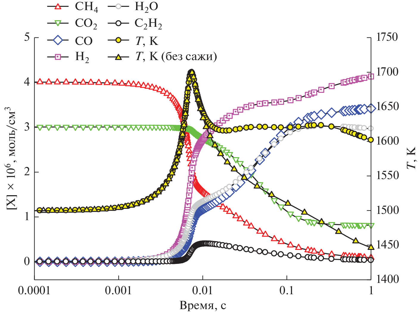 The influence of the formation of microheterogeneous soot particles on the gas-phase conversion of rich mixtures of methane with oxygen into synthesis gas in the temperature range from 1500 to 1800 K under the conditions of an adiabatic reactor was studied by kinetic modeling. The effect of CO2 and H2O additives on this process was studied. The appearance of soot particles is observed in rich mixtures, starting from the fuel excess factor ϕ = 3.33. At relatively low temperatures ~1500 K, a small amount of microheterogeneous soot particles is formed, which do not significantly affect the other components of the reacting system. A noticeable effect of soot particles at this temperature is observed at a higher value of ϕ = 8.0. This is most clearly manifested in the temperature profile of the process, in which, with the addition of water, two maxima are observed at times of the order of 0.01 and 0.1 s. In the case of CO2 additions, the second maximum on the temperature profile is almost not pronounced. A complex temperature profile leads to the appearance of the second maximum concentration of OH hydroxyl radicals at times of ~0.1 s. The addition of H2O and CO2 makes it possible to vary the H2/CO ratio in the synthesis gas over a wide range, which is necessary for the synthesis of various products. Since the added CO2 under these conditions is actually involved in the chemical process of obtaining synthesis gas, its partial recirculation from the conversion products makes it possible to reduce its emission during the production of synthesis gas.