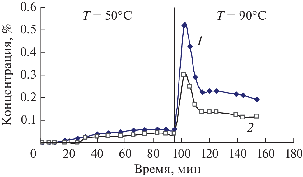 Pd-containing catalysts (1%Pd/Al2O3 and 5%Pd/Al2O3) deposited on aluminum oxide were studied in the decomposition reaction of hydrazine monohydrate. According to in situ IR spectroscopy, it was found that hydrazine monohydrate is adsorbed on the coordination unsaturated centers of the catalyst surface in a linear form. When the temperature rises, the adsorbed hydrazine monohydrate loses a water molecule, which is accompanied by a change in the geometry of the molecular complex. Adsorption of hydrazine on a support and its diffusion onto palladium clusters is a more advantageous process than direct adsorption on active centers. This circumstance shows that the hydrazine adsorbed on the support can be an intermediate of its decomposition process. The studied catalysts have a maximum activity in the temperature range of 100–120°C, while the ratio of hydrogen and nitrogen concentrations in the reaction products was equal to 2, which corresponds to 100% selectivity for hydrogen. As the reaction temperature increases, the selectivity decreases significantly. The explanation of the high selectivity for hydrogen at low temperatures is due to the fact that the adsorption of N2H4 is carried out through the formation of hydrogen–metal bonds. The hydrogen–metal bond strength in such a complex is higher than the nitrogen–metal bond strength, hence the barrier for breaking the N–H bond is lower than the barrier for breaking N–N bond, which leads to breaking N–H bond and preserving the N–N bond. At elevated temperatures, some of the hydrogen atoms formed recombine, the other reacts with the surface complexes of hydrazine to form the intermediate NH3–NH3, the breaking of the bond in which leads to the formation of ammonia molecules in the gas phase.