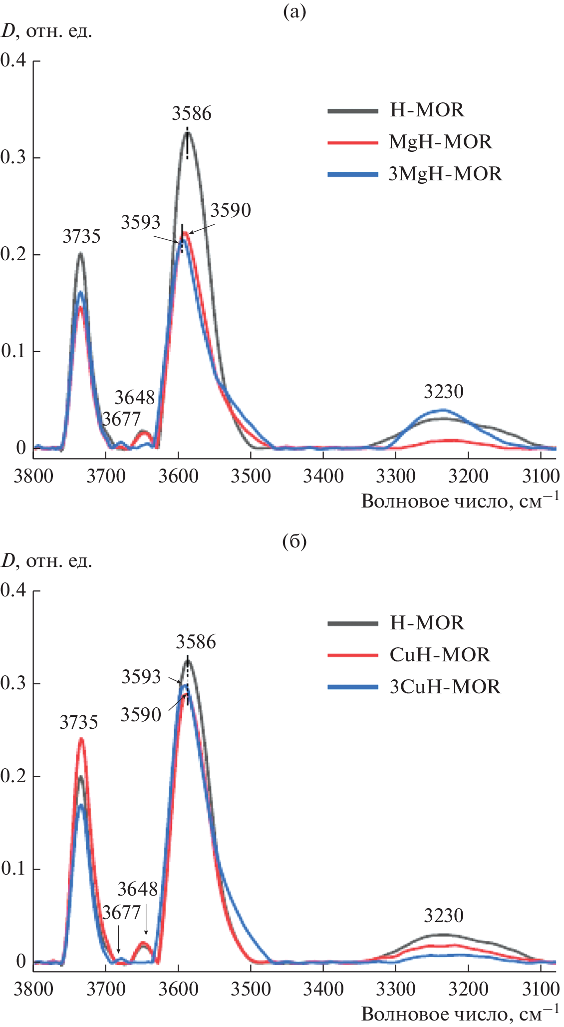 На мордените и феррьерите (SiO2/Al2O3 ≈ 20, “Zeolyst International”) изучены адсорбция, термопрограммированная десорбция и карбонилирование диметилового эфира (ДМЭ). Рассмотрено влияние введения ионным обменом катионов Cu, Co, Mg. Карбонилирование ДМЭ проводили при 200°С, давлении 3 МПа, объемной скорости 8000 мл г–1 ч–1 в смеси (об. %): ⁓2.2 ДМЭ, 92.8–95.5 СО, ост. N2. После индукционного периода содержание метилацетата примерно в 4–5 раз выше для морденита по сравнению с феррьеритом. Образование воды, метанола и углеводородов наблюдается в незначительных количествах. Введение в морденит ионным обменом катионов Cu, Co, Mg (однократный ионный обмен, соотношение катион/Al не более 35%) не только повышает стабильность, но и приводит к возрастанию активности в реакции карбонилирования ДМЭ. Обнаружено, что увеличение содержания меди (с 1.19 до 2.23 мас. %) и Mg (c 0.62 до 1.8 мас. %) по-разному влияет на активность. В случае меди наблюдается ее рост, тогда как в случае магния – падение. Предварительное восстановление медьобменного морденита приводит к появлению частиц металлической меди на поверхности кристаллитов морденита и снижению активности. По данным инфракрасной спектроскопии диффузного отражения in situ введение катионов магния трехкратным ионным обменом ведет к заметному сокращению количества Бренстедовских кислотных центров (БКЦ) как в каналах морденита 12-MR, так и 8-MR. Каталитические характеристики феррьерита при введении ионным обменом меди и магния практически не изменяются.