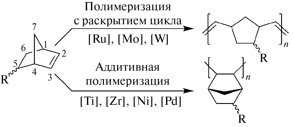 Норборнен (НБ) и его производные (НБ-R) – доступный и перспективный класс циклоолефинов для применения в качестве мономеров [4–7]. Их источниками являются крупнотоннажные продукты нефтепереработки: циклопентадиен, этилен, алкены [3]. Существуют два основных метода полимеризации циклоолефинов. Первый – полимеризация с раскрытием цикла под действием катализаторов метатезиса (схема 1) [3, 5, 7, 8–10], который хорошо разработан благодаря работам групп Шрока (Schrock R. R.) [8, 11], Граббса (Grubbs R. H.) [12–14], Ховейды (Hoveyda A. H.) [15, 16] и др. Метатезисные полимеры используются в качестве маслопоглотителей, виброи звукопоглощающих материалов, а также материалов с повышенной ударной вязкостью и коррозионной стойкостью. Коммерчески доступные катализаторы на основе комплексов рутения [10] обладают высокой каталитической активностью, устойчивостью к функциональным группам.