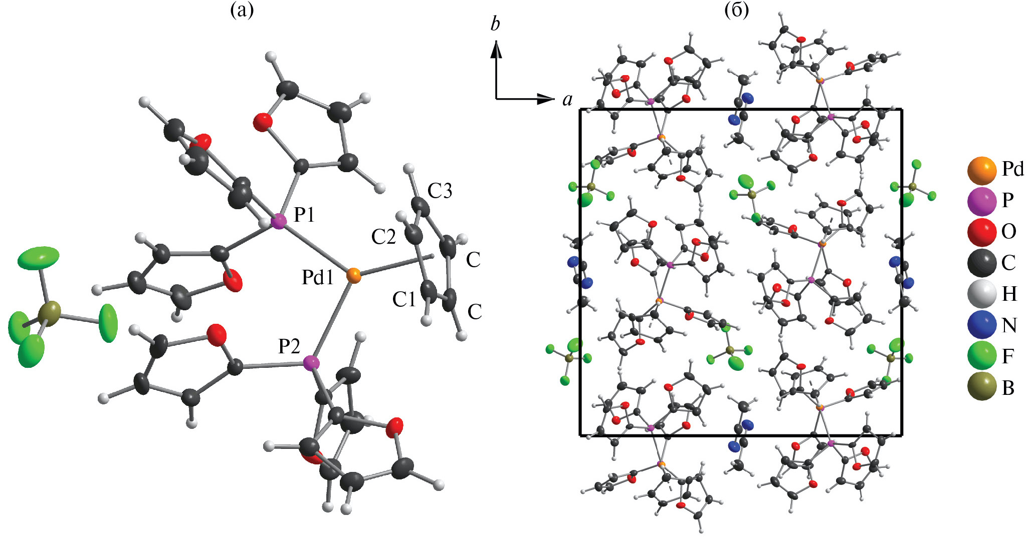 Для структуры III также можно отметить, что плоскость, содержащая металл и два атома фосфора лиганда, почти перпендикулярна (89.77°) к плоскости, проведенной через атомы С1, С2, С4 и С5 кольца Cp. При этом атом C₃, находящийся в вершине координационного многогранника, выходит из плоскости, образованной остальными атомами углерода циклопентадиенила, на 0.126 Å. Таким образом, расстояние Pd1–C₃, равное 2.239(4) Å, оказывается несколько короче расстояний Pd1–C1, Pd1–C2, Pd1–С4 и Pd1–С5 (2.309(4), 2.342(4), 2.327(4), 2.275(4) Å соответственно). Стерическая загруженность координационной сферы палладия двумя молекулами трис(2-фурил)фосфина (TFP) характеризуется валентным углом ∠P1–Pd1–P₂ = 98.14(4)°, что несколько выше известных аналогов (сравн. ∠P1–Pd1–P₂ = 96.85° для [Pd(acac)(TFP)₂]BF₄ и 93.88° для цис-Pd(TFP)₂Cl₂∙0.5CH₂Cl₂ [53, 54]). Длины связей Pd–P находятся в интервале 2.254(1)–2.257(1) Å и незначительно удлинены по сравнению с литературными аналогами (для [Pd(acac)(TFP)₂]BF₄: l(Pd–P) = 2.2406(8)–2.2500(8) Å; для цис-Pd(TFP)Cl₂∙0.5CH₂Cl₂: l(Pd–P) = 2.2329(10)–2.2613(9) Å [53, 54]). Анализ межатомных расстояний свидетельствует о наличии коротких контактов между атомами фтора тетрафтороборатного аниона и атомами водорода трис-2-фурилфосфиных лигандов (l = 2.355 … 2.552 Å, что меньше суммы соответствующих Ван-дер-Ваальсовых радиусов атомов H и F (2.67 Å)). Анализ длин связей и углов иона [BF₄]– указывает на небольшое искажение его тетраэдрической геометрии (например, l(B1–Fi) = 1.360(7)…1.393(6) Å). Это можно объяснить наличием слабых нековалентных взаимодействий между атомами H ароматических заместителей и атомами F.