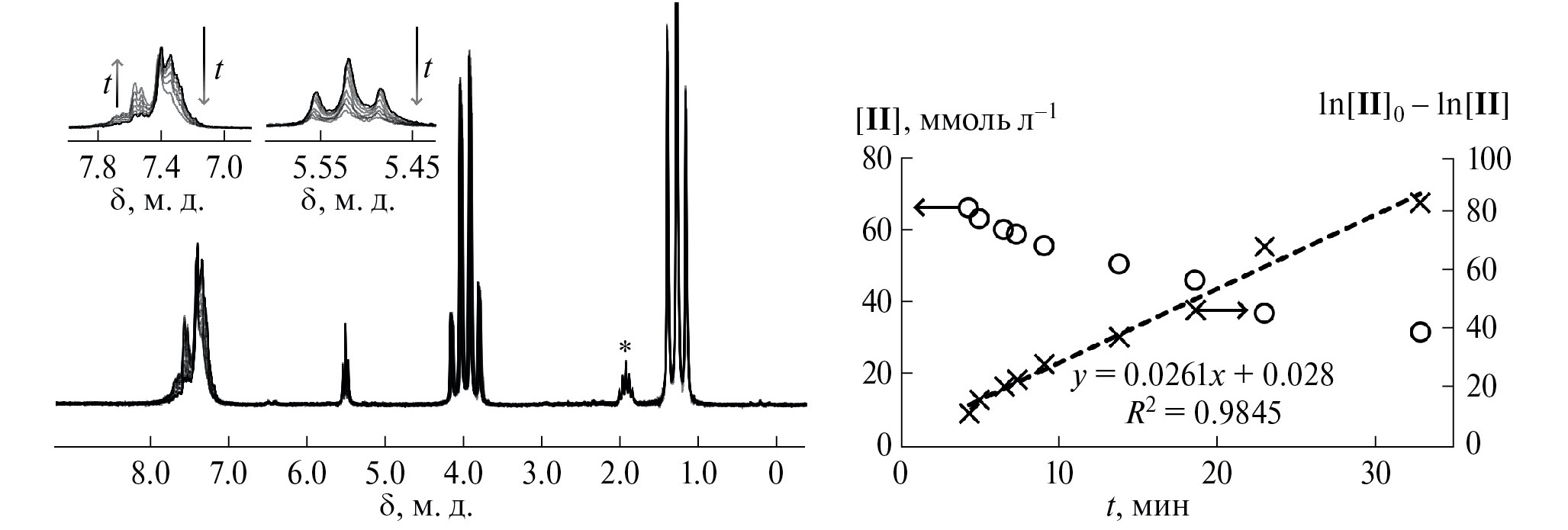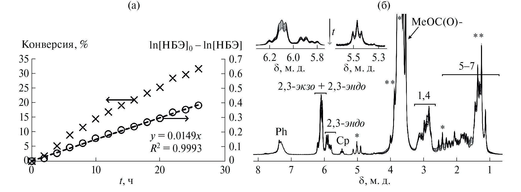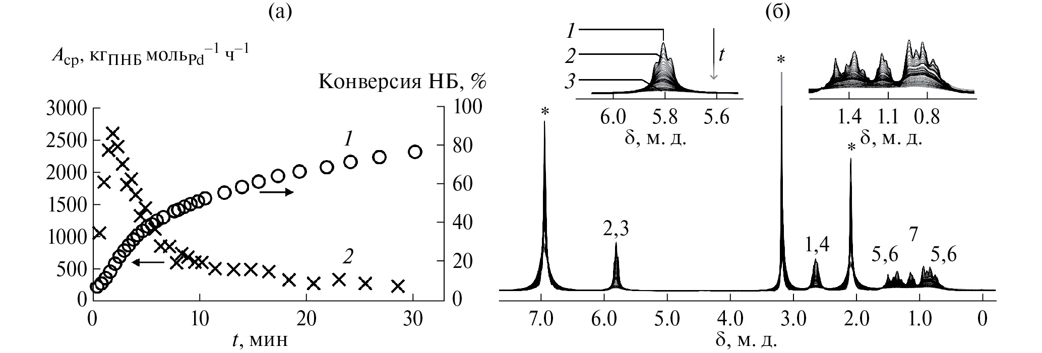 Рис. 3. (а) – Зависимость конверсии НБ (1) и активности (2) от времени реакции полимеризации НБ; (б) – ¹H ЯМР спектры реакционной смеси в зависимости от времени реакции (1 – 0.4 мин, 2 – 2.0 мин, 3 – 30.0 мин; * – сигналы от растворителя в спектре; сигналы от НБ пронумерованы согласно схеме 1). Условия реакции: каталитическая система – II/25BF₃ ∙ OEt₂, n(Pd) = 1.25 мкмоль, [НБ]₀ = 4.0 моль/л; [НБ]₀ : [Pd]₀ = 5000, V₀ = 0.8 мл, T = 40°C, растворитель – Vтолуол : V₁,₂-дихлорэтан = 3.75 : 1.