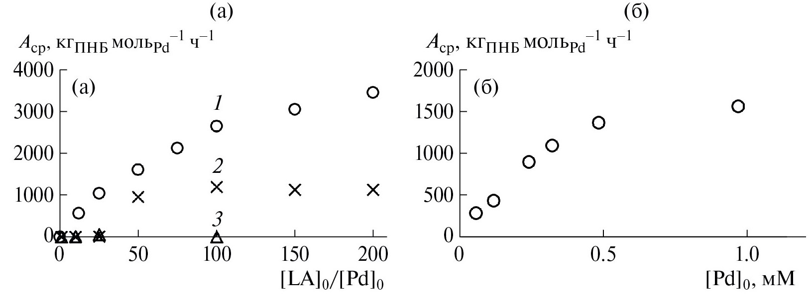 Рис. 4. Зависимость средней активности катализатора в полимеризации НБ: (а) – от молярного соотношения и природы кислоты в реакционной смеси (LA = BF₃∙OEt₂ (1), AlCl₃ (2); H(OEt₂)₂∙BF₄ (3)); (б) – от начальной концентрации II. Условия реакции: (а) – каталитическая система – II/mLA, n(Pd) = 3 мкмоль, [НБ]₀ : [Pd]₀ = 5000, T = 25°C, t = 5 мин, [НБ]₀ = 4.8 моль/л, растворитель – толуол; (б) – каталитическая система – II/50BF₃∙OEt₂, T = 25°C, [НБ]₀ = 4.8 моль/л, остальные условия см. оп. 1–6 в табл. 2.