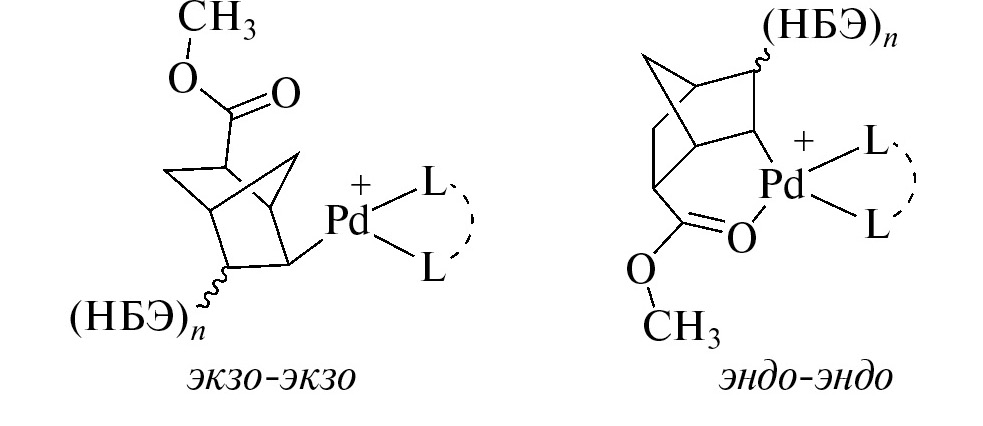 Схема 3. Предполагаемые структуры интермедиатов в полимеризации экзо-НБЭ (слева) и эндо-НБЭ (справа) согласно [65]. Анион опущен.
