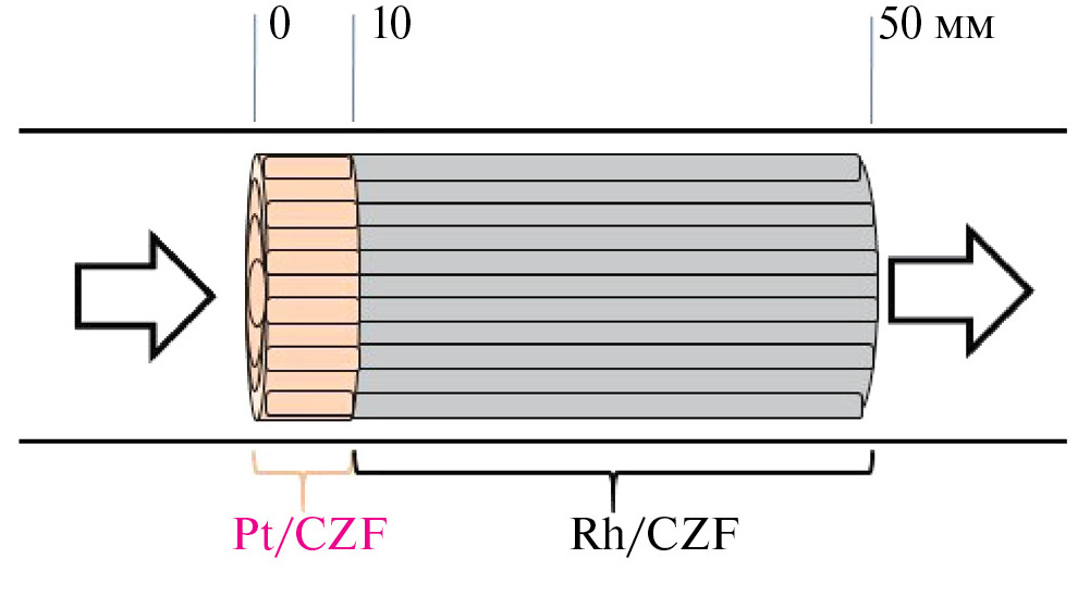 Для увеличения активности катализатора в реакциях с участием кислорода воздуха была применена двухзонная каталитическая система, состоящая из блока Pt/CZF, расположенного в лобовой части каталитического слоя, и блока Rh/CZF, находящегося в хвостовой части слоя (рис. 1).
