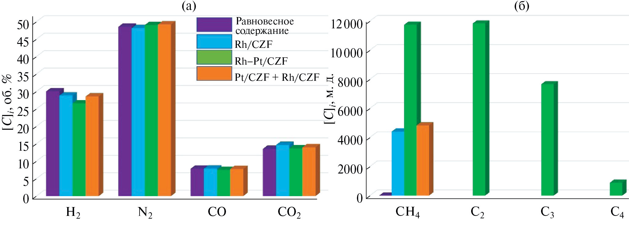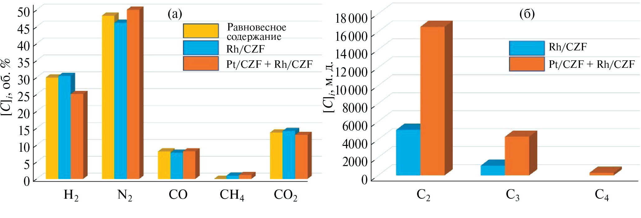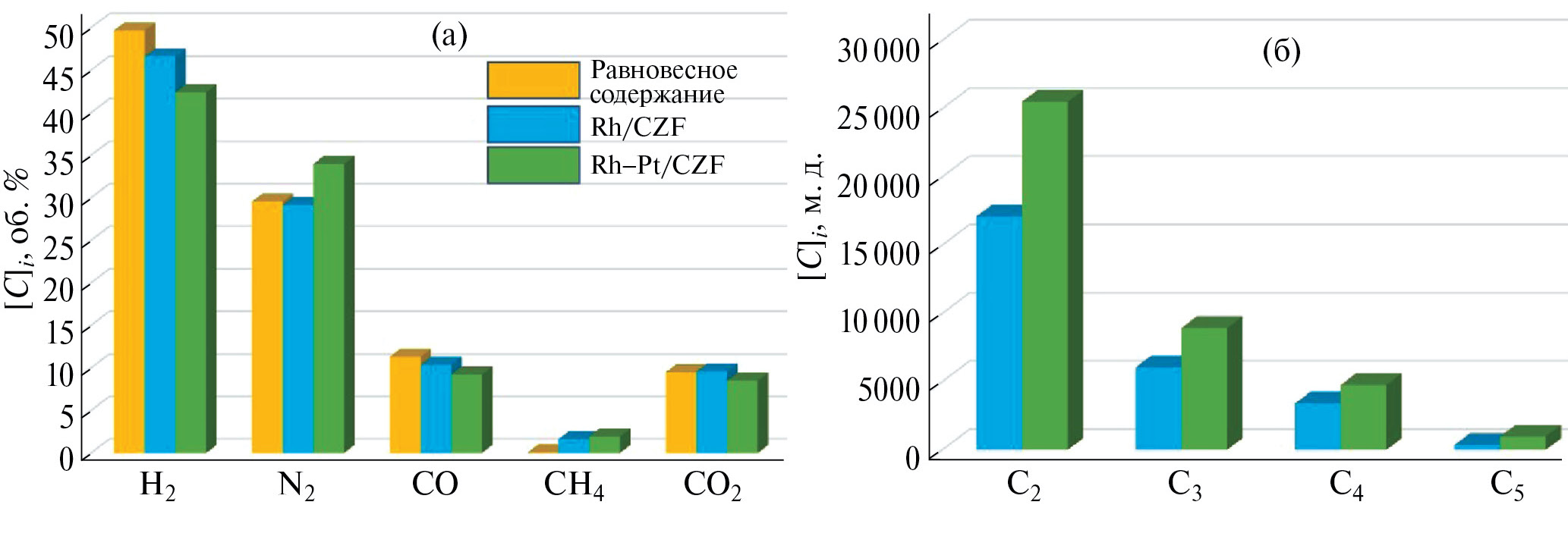 Приготовленные образцы Rh/CZF и Rh–Pt/CZF были исследованы в ПК ДТ. На рис. 2 представлено распределение продуктов конверсии (в пересчете на сухой газ) после 10 ч в потоке. Конверсия топлива равна 98.5 и 97.4% для Rh/CZF и Rh–Pt/CZF соответственно. Стоит отметить, что состав реформата на выходе из Rh/CZF ближе к равновесному, а содержание побочных продуктов С₂–С₅ ниже, чем на выходе из Rh–Pt/CZF.