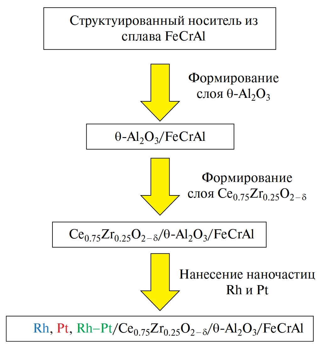 После последней пропитки блок помещали в раствор осадителя для старения в течение 24 ч. Затем образец промывали дистиллированной водой до достижения нейтрального pH, высушивали при 80°C и прокаливали при 800°C в течение 1 ч. Таким образом, был получен структурированный носитель Ce₀.₇₅Zr₀.₂₅O₂–δ /θ-Al₂O₃ /FeCrAl, который далее обозначен как CZF. Ниже представлена схема синтеза структурированных катализаторов (схема 1).