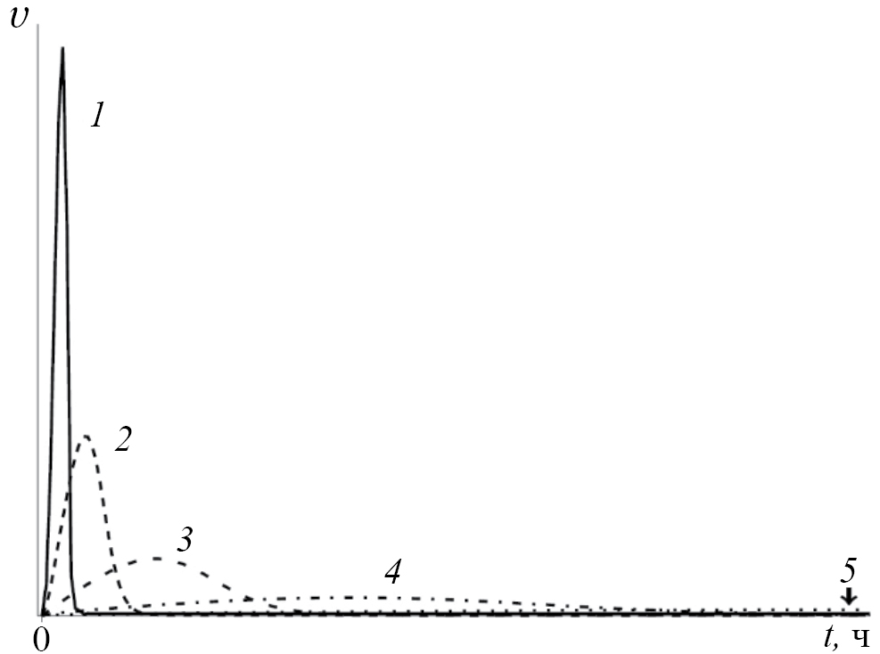 Рис. 1. Результаты моделирования динамики поликонденсации молочной кислоты в каплях с радиусом, мкм: 27 (1), 58 (2), 125 (3), 270 (4), 582 (5). Стрелка указывает положение максимума на кривой 5.