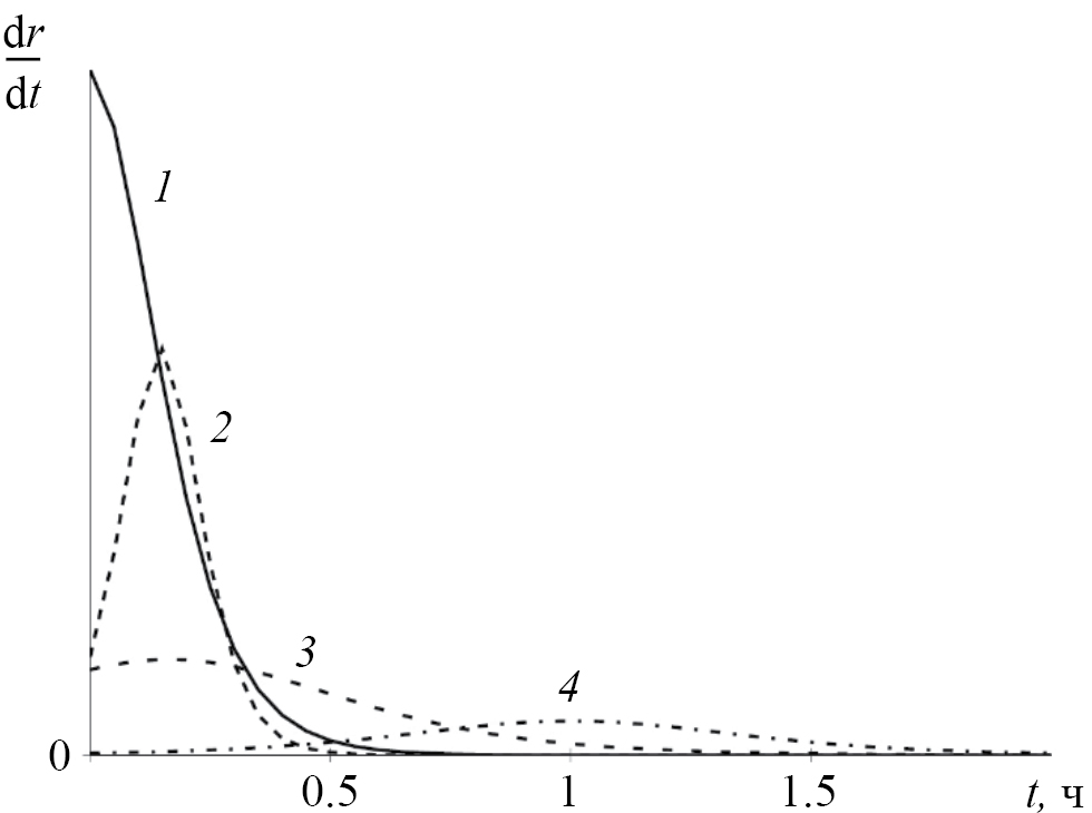 Рис. 2. Изменение скорости контракции при высыхании сидячих капель раствора молочной кислоты в процессе поликонденсации с радиусом, мкм: 2 (1), 10 (2), 14 (3), 30 (4).