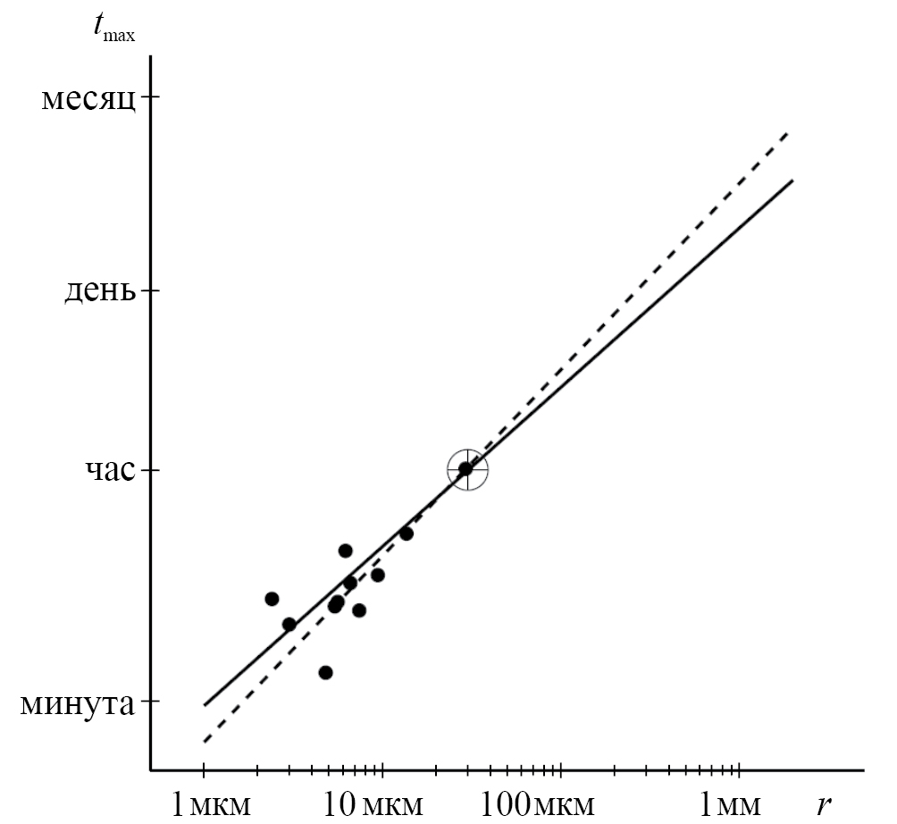 Рис. 3. Теоретическая и экспериментальная (пунктир) оценки времени достижения максимума скорости поликонденсации в зависимости от радиуса капли. Теоретическая зависимость нормирована по капле радиусом 30 мкм (окружность).