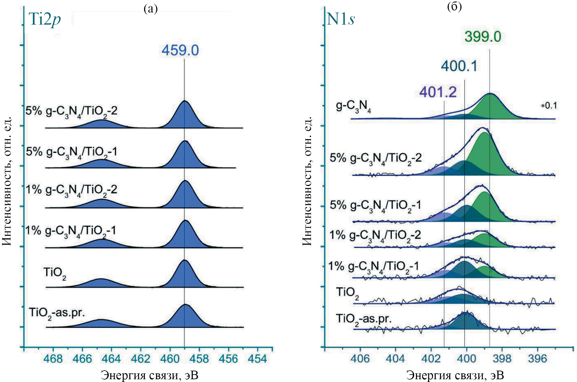 Химический состав поверхности катализаторов был исследован методом РФЭС. Относительные концентрации (атомные соотношения) элементов в приповерхностном слое катализаторов и значения энергий связи Ti2p3/2, N1s, O1s и C1s в спектрах исследованных образцов приведены в табл. 2. Спектры Ti2p изученных образцов показаны на рис. 2а. Как известно, спектр Ti2p вследствие спин-орбитального взаимодействия представляет собой дублет Ti2p3/2–Ti2p1/2 с величиной спин-орбитального расщепления 5.7 эВ. В спектре Ti2p образцов присутствует один дублет с энергией связи Ti2p3/2 равной 459.0 эВ, что соответствует титану в состоянии Ti4+. Следов титана в другом химическом состоянии не наблюдается. В литературе для TiO2 приводятся значения энергии связи Ti2p3/2 в диапазоне 458.7–459.2 эВ [37–42]. На рис. 2б представлены спектры N1s исследованных образцов. Пик в районе 399.0 эВ можно отнести к атомам азота, образующим связь C–N=C, в районе 400.1 эВ – к атомам азота, образующим связь с тремя атомами углерода N–(C)3, в районе 401.0–401.3 эВ – к терминальным группам N–H [43, 44].