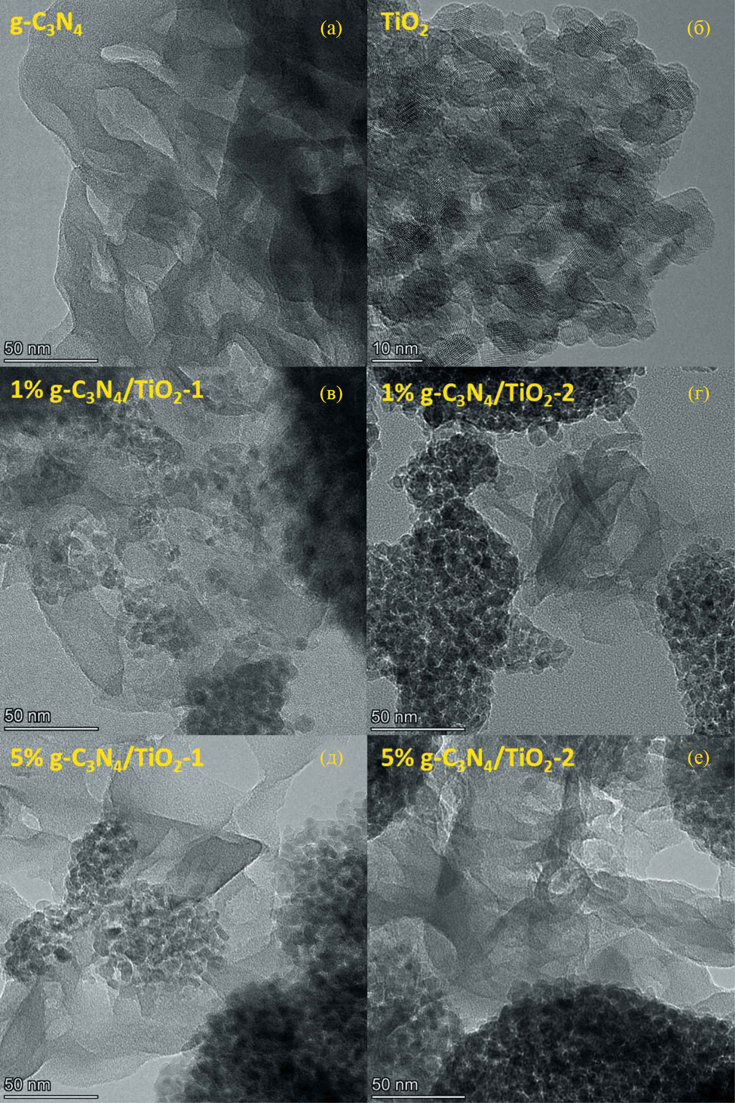 Композиты образцов g-C3N4/TiO2 в работе были приготовлены двумя разными способами и в двух разных концентрациях g-C3N4: 1 и 5 мас. % от TiO2. В первом случае g-C3N4 в количестве 1 или 5 мас. % добавляли сразу в 10 мл тетробутоксида титана. Смесь выдерживали в течение 5 мин в ультразвуковой ванне, далее вливали спирт (10 мл) и воду (40 мл). Синтезированные таким образом фотокатализаторы далее по тексту обозначены как X% g-C3N4/TiO2-1, где X – массовая доля g-C3N4 в композитном образце. Полученный гель сушили в сушильном шкафу при температуре 80°С в течение 12 ч.