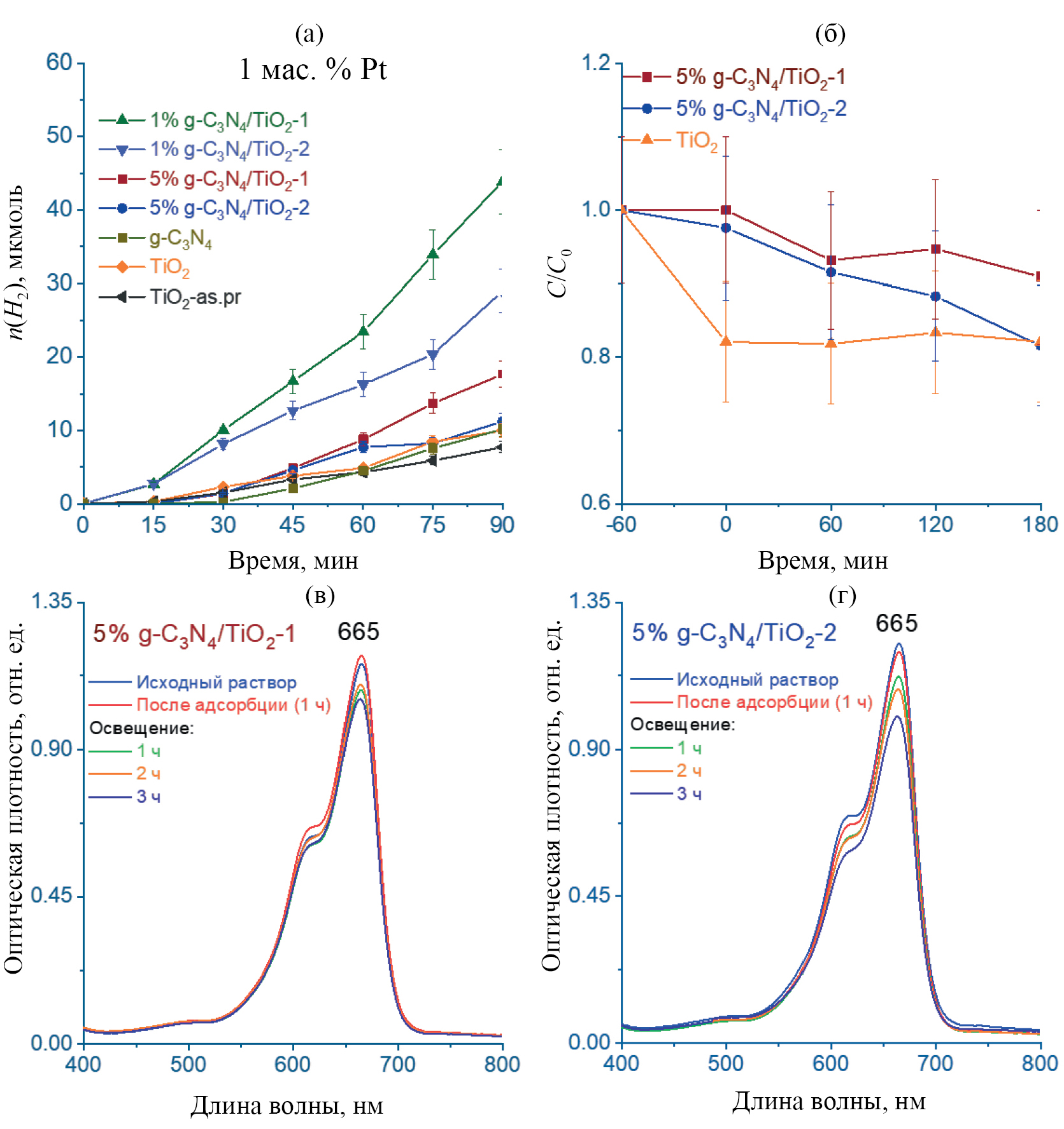 Рис. 4. Кинетические кривые выделения водорода из водного раствора этанола в присутствии фотокатализаторов с нанесенной платиной (а) и изменения концентрации МС (б); изменения оптической плотности раствора МС в ходе проведения фотокаталитической реакции в присутствии 5% g-C3N4/TiO2-1 (в) и 5% g-C3N4/TiO2-2 (г).