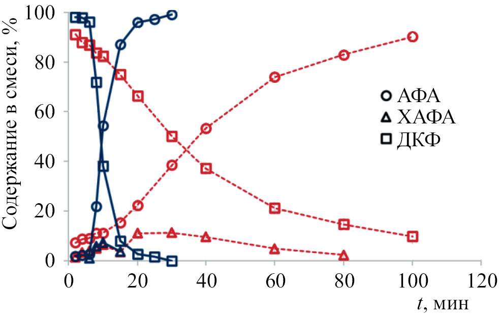 в котором C0 и Ct (ммоль/л) – концентрации ДКФ в исходной смеси и через t мин после начала реакции. Значения конверсии ДКФ рассчитаны с относительной погрешностью ~5%.