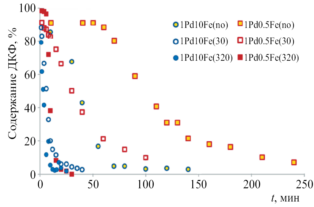 На рис. 2 представлена зависимость содержания ДКФ в реакционной смеси от времени реакции (II) для невосстановленных образцов 1Pd0.5Fe и 1Pd10Fe (обозначены 1Pd0.5Fe(no) и 1Pd10Fe(no)), а также после их восстановления в жестких и мягких условиях. Температура предварительного восстановления катализаторов указана в скобках после обозначения образца.