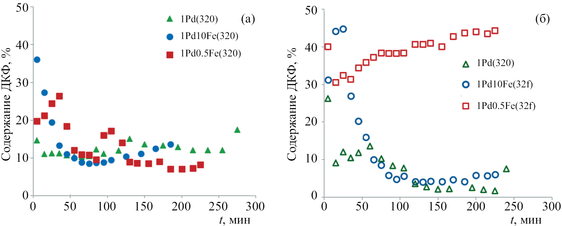 Тестирование катализаторов, восстановленных при 30°С (рис. 3б), показало, что кривые зависимости конверсии ДКФ от времени опыта для 1Pd10Fe(30f) и 1Pd10Fe(320) похожи. Отличие состоит в том, что для 1Pd10Fe(30f) наблюдается отчетливый начальный период снижения конверсии ДКФ, после чего, как и на образце 1Pd10Fe(320), конверсия сначала медленно растет, а после 200 мин тестирования еще медленнее снижается. В присутствии 1Pd0.5Fe(30f) конверсия ДКФ значительно ниже, чем на 1Pd0.5Fe(320), причем она постепенно падает. Катализатор 1Pd(30f) наиболее стабилен: на протяжении всего эксперимента конверсия ДКФ в его присутствии возрастает.
