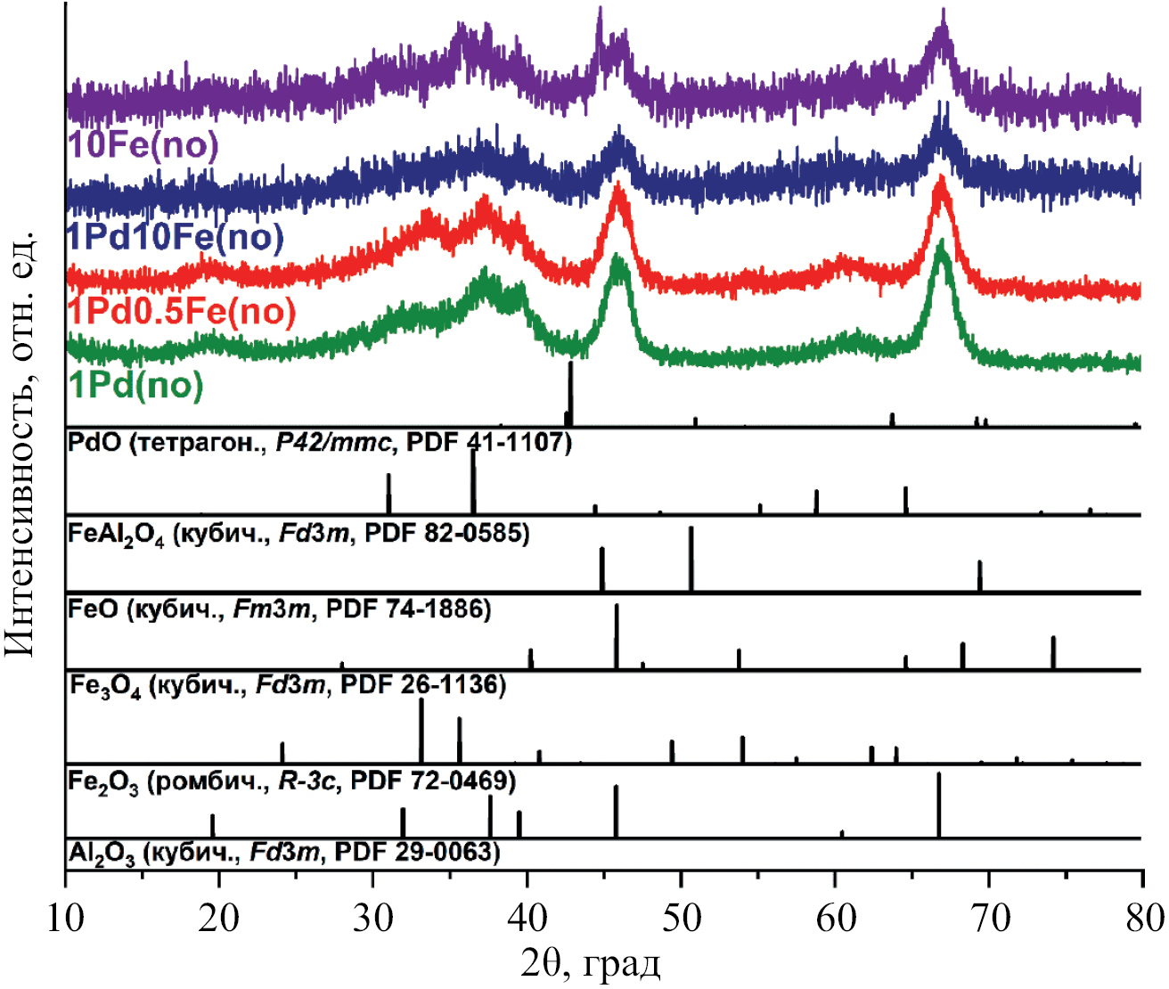 В литературе описано существование шпинельных структур герцинита (hercynite) FeAl2O4 [33], формирующихся при взаимодействии FeO и Al2O3 [34], однако объемные шпинельные фазы образуются только при высокотемпературном прокаливании или при использовании других приемов, которые не применяли в настоящей работе. Идентификация методом РФА затруднена из-за наложения рефлексов герцинита, Fe2O3 и γAl2O3 [35]. Можно лишь предположить, что шпинельные структуры могут формироваться на границах контакта фаз оксидов железа и Al2O3. Образование новых центров в большей степени влияет на состояние палладия в составе 1Pd10Fe в связи с преобладанием железа в этом образце и является одной из причин его повышенной активности в реакторе периодического действия после мягкого восстановления.