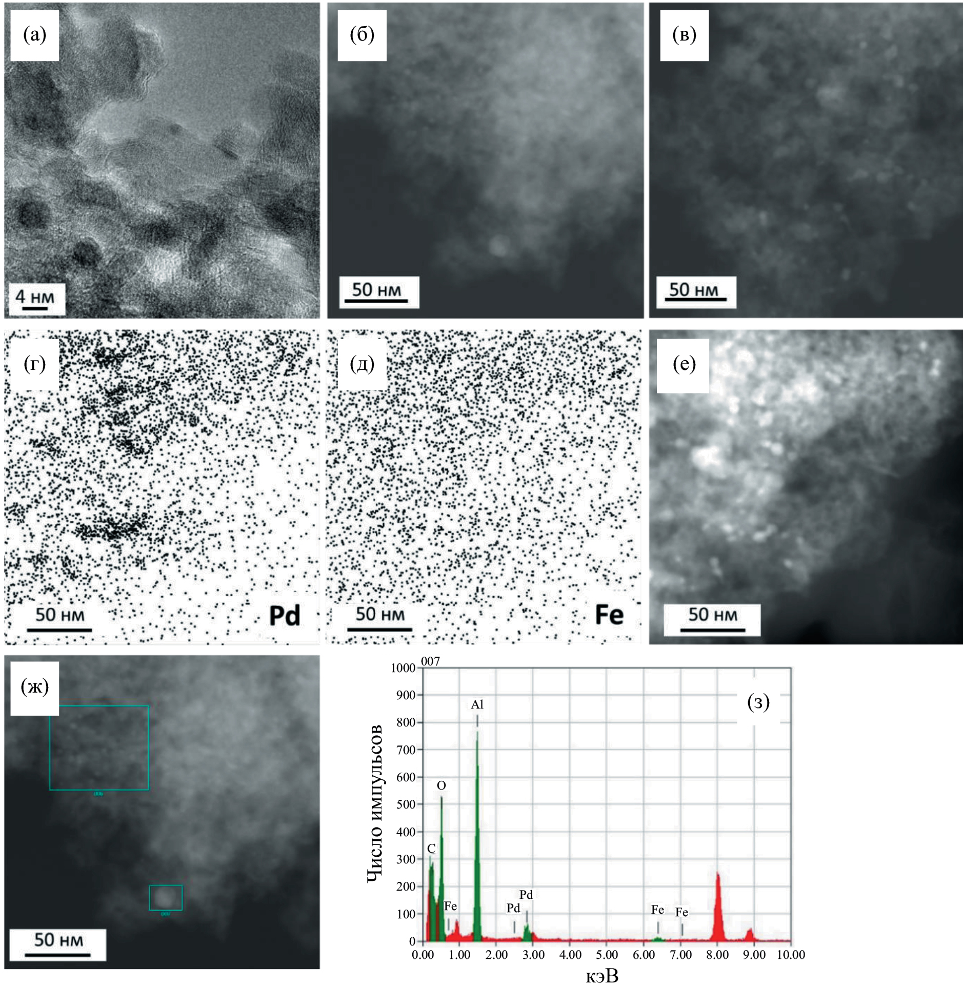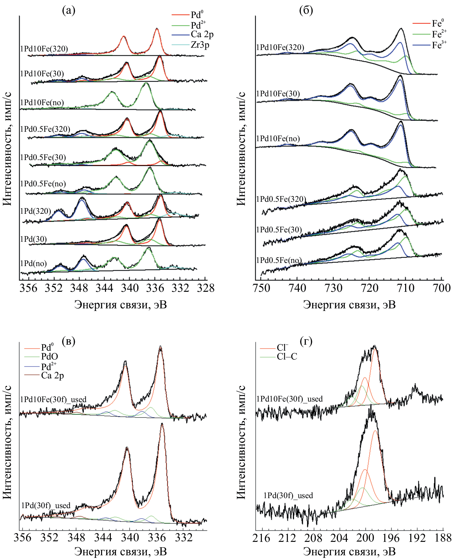 Рентгеновские фотоэлектронные спектры (РФЭС) регистрировали на спектрометре Axis Ultra DLD (“Kratos Analytical”, Великобритания), монохроматическое AlKα-излучение. Шкалу энергии спектрометра предварительно калибровали по энергиям связи линий Au4f7/2 (83.96 эВ), Ag3d5/2 (368.21 эВ) и Cu2p3/2 (932.62 эВ) чистых металлов. Спектры высокого разрешения регистрировали при энергии пропускания анализатора 40 эВ с применением нейтрализатора и калибровали по положению линии Al2p, принятому равным 74.6 эВ. Спектры Pd3d описывали с помощью синтетических компонент, соответствующих состояниям палладия Pd0 и Pd2+, а спектры Fe2p – с помощью компонент, соответствующих состояниям железа Fe0, Fe2+ и Fe3+, как это указано в работе [9]. Для описания спектров Pd3d образцов после каталитических испытаний использовали три дублета, соответствующих Pd0, PdO и PdCl2.
