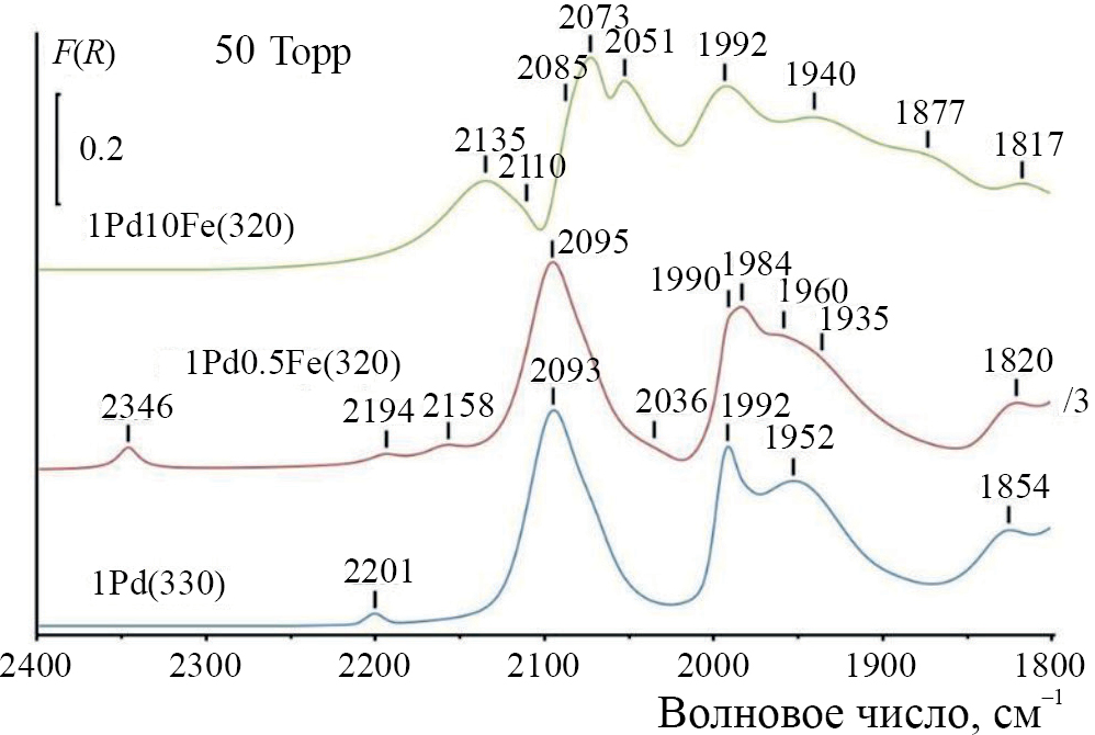 ИК-спектры диффузного отражения (ИК ДО) записывали на приборе EQUINOX 55/S (“Bruker”, Германия) в интервале длин волн 4000–800 см−1 с разрешением 4 см−1 и усреднением по 1024 сканам. Порошок катализатора помещали в кварцевую ампулу с окошком из фторида кальция, прокаливали при 550°С в вакууме не хуже 5 × 10−5 Торр в течение 1 ч для удаления гидроксильного покрова, затем охлаждали до 320°С, напускали в ампулу водород до давления 180 Торр и оставляли при этой температуре на 1 ч. Далее образец охлаждали до 150°С, вакуумировали до давления примерно 5 × 10−5 Торр и охлаждали до комнатной температуры. После этого регистрировали фоновый спектр. Затем напускали в ампулу СО и записывали спектры при давлении СО 5, 20 и 50 Торр. Дифференциальные спектры адсорбированного СО получали вычитанием фонового спектра из экспериментального с последующей коррекцией базовой линии с помощью программного обеспечения OPUS 6.0 (“Bruker”, Германия).