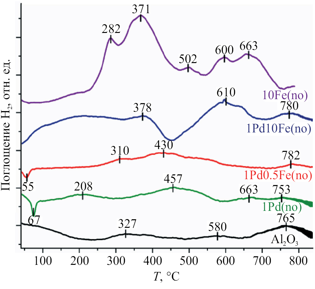 Отметим, что поглощение водорода в интервале до 430°С заметно выше для 1Pd10Fe(no), чем для 1Pd0.5Fe(no), так как последний содержит меньше железа, причем оно, по данным РФЭС, менее склонно менять степень окисления в ходе обработки водородом.
