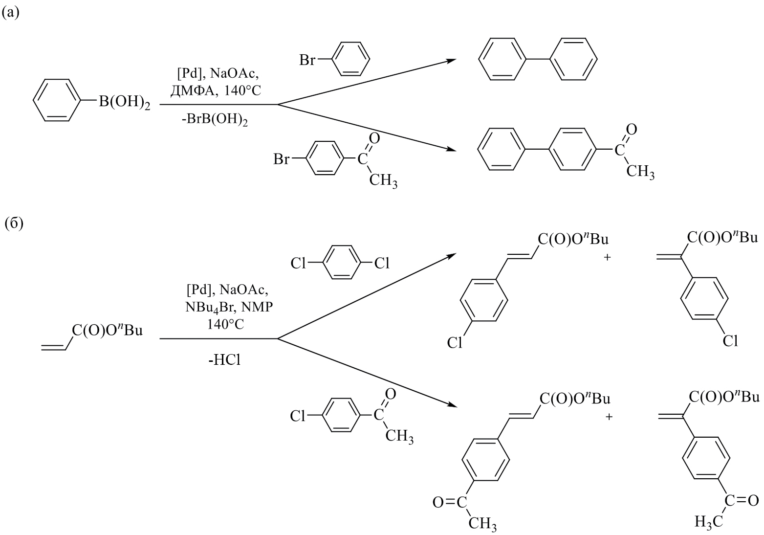 В конкурентной реакции Мицороки–Хека конкурирующие 4-хлорацетофенон и 1,4-дихлорбензол (по 5 ммоль каждого) и нафталин в качестве внутреннего стандарта для хроматографии (0.5 ммоль) растворяли при комнатной температуре в 2.5 мл N-метилпирролидона (NMP). Полученный раствор вводили в стеклянный реактор, снабженный резиновой мембраной и магнитным мешальником, содержащий н-бутилакрилат (0.625 ммоль), ацетат натрия (3.25 ммоль) в качестве основания, NBu4Br (2.5 г) и палладиевый предшественник катализатора (0.006–0.015 ммоль). Реакцию начинали, помещая реактор в предварительно нагретую до 140°С масляную баню при перемешивании (480 об/мин). Пробы реакционной смеси периодически отбирали из реактора с помощью шприца с металлической иглой. Для хроматографического анализа 100 мкл пробы реакционного раствора экстрагировали 100 мкл смеси толуол/вода (1/1). Продолжительность реакции составляла 1–2 ч.