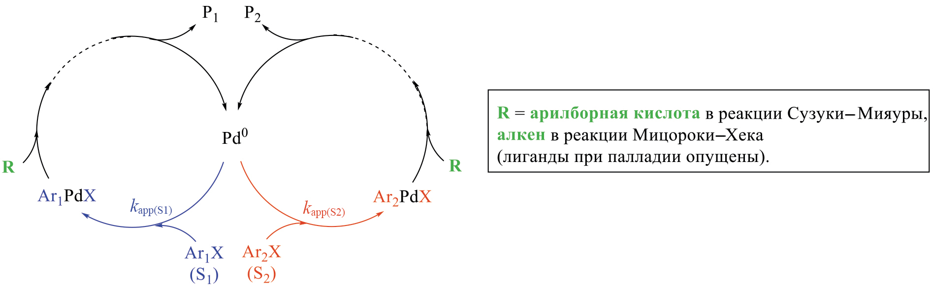 Схема 2. Принципиальная схема реакций Сузуки–Мияуры и Мицороки–Хека при использовании пары конкурирующих арилгалогенидов.