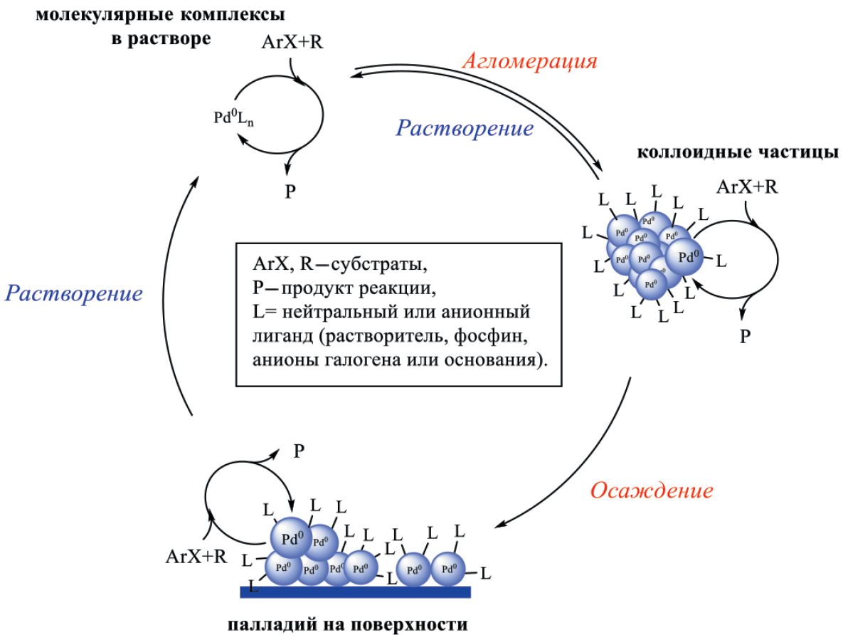 Схема 3. Общая схема взаимопревращения сосуществующих форм катализатора в ходе реакций сочетания арилгалогенидов.