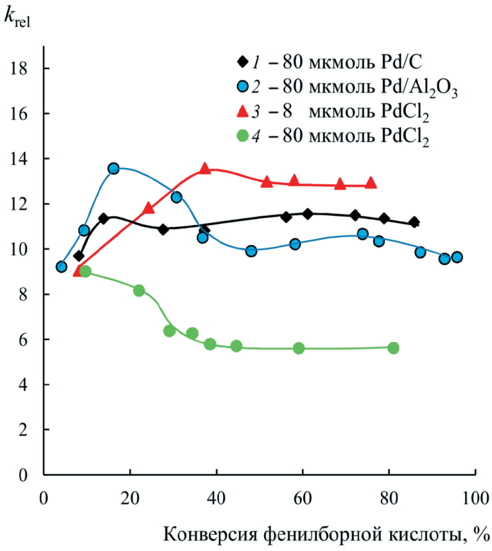 В конкурентной реакции Сузуки–Мияуры конкурирующие бромбензол и 4-бромацетофенон (по 5 ммоль каждого) и нафталин в качестве внутреннего стандарта для хроматографии (1 ммоль) растворяли при комнатной температуре в 5 мл N,N-диметилформамида (ДМФА). Полученный раствор вводили в стеклянный реактор, снабженный резиновой мембраной и магнитным мешальником, содержащий фенилборную кислоту (5 ммоль), ацетат натрия (6.5 ммоль) в качестве основания и палладиевый предшественник катализатора (0.008–0.08 ммоль). Реакцию начинали, помещая реактор в предварительно нагретую до 140°С масляную баню при перемешивании (480 об/мин). Пробы реакционной смеси периодически отбирали из реактора с помощью шприца с металлической иглой. Для хроматографического анализа 100 мкл пробы реакционного раствора экстрагировали 100 мкл хлороформа. Продолжительность реакции составляла 3–7 ч.