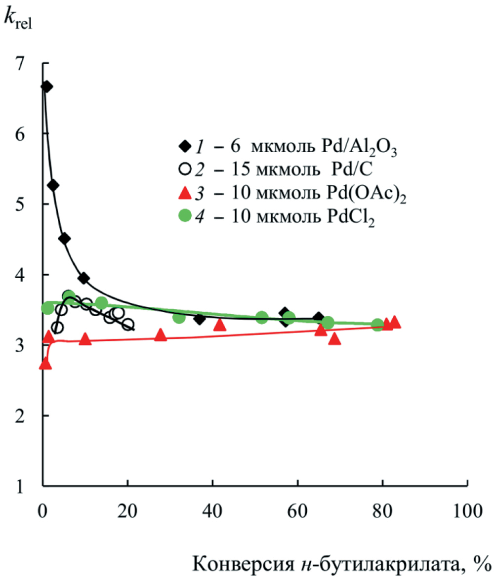 Закономерности относительной реакционной способности конкурирующих 4-хлорацетофенона и 1,4-дихлорбензола в реакции Мицороки–Хека (схема 1б) в условиях применения растворимых и нерастворимых гетерогенных палладиевых предшественников катализатора приведены на рис. 2. Поскольку в реакции Мицороки–Хека в качестве продуктов превращения каждого из конкурирующих арилгалогенидов образуются α- и β-региоизомерные дизамещенные алкены, krel рассчитывали по уравнению (7) с использованием суммарных концентраций таких продуктов. Как следует из полученных данных, величины krel при применении растворимых (PdCl2 и Pd(OAc)2) и нерастворимого (Pd/C) предшественников катализатора незначительно варьировались лишь при очень низких степенях превращения общего для конкурирующих арилхлоридов алкена, достигая примерно одинакового значения, которое далее оставалось практически неизменным на всем протяжении каталитической реакции. Существенные отклонения krel на начальном этапе реакции были лишь в случае использования другого гетерогенного предшественника – Pd/Al2O3 – и тоже при очень низких степенях превращения, после чего наблюдаемое значение относительной реакционной способности совпадало со значениями, найденными в экспериментах с другими предшественниками (рис. 2). Полученные закономерности позволяют сделать заключение об образовании в условиях реакции Мицороки–Хека при применении различных растворимых и нерастворимых предшественников преимущественно одной стабильной на протяжении практически всего каталитического процесса активной формы катализатора, которой, в соответствии с приведенными выше рассуждениями, являются истинно растворенные молекулярные комплексы палладия.
