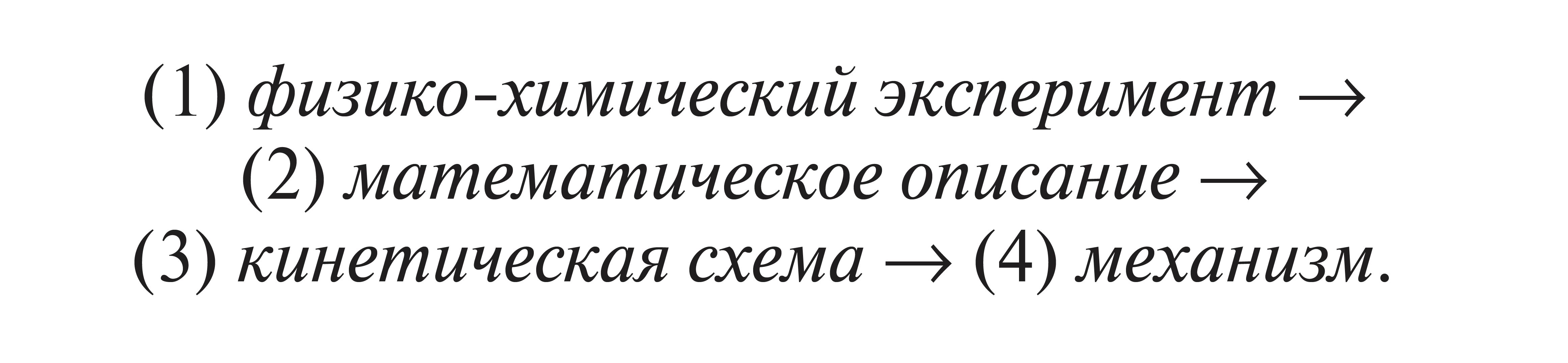 Очевидно, что этими целями и задачами должны определяться стратегии исследования, принимаемые и применяемые явно или интуитивно. Однако, к сожалению, примеры явным образом прописанных стратегий немногочисленны. Одним из них можно с уверенностью назвать подход, представленный в работах О.Н. Темкина (см., например, [1–4]). Итогом этих работ можно считать фундаментальную монографию [5]. Хотя она формально относится к области гомогенного металлокомплексного катализа, изложенные в ней обобщенные принципы имеют значение и “работают” в отношении исследования любого каталитического процесса. Причина этого в том, что катализ вообще представляет собой кинетическое явление. Поэтому исследование механизма любого каталитического процесса с необходимостью должно опираться, наряду с данными физико-химических исследований, на твердый кинетический фундамент и учитывать всю полноту кинетической информации, которая может быть получена. Целиком кинетической представляется одна из наиболее полных формулировок самого понятия механизма сложных реакций [3] как информации о последовательности элементарных стадий, приводящих к образованию продуктов реакции из реагентов, величинах констант скорости, составе, структуре и реакционной способности интермедиатов, включая центры катализатора и их состояние.