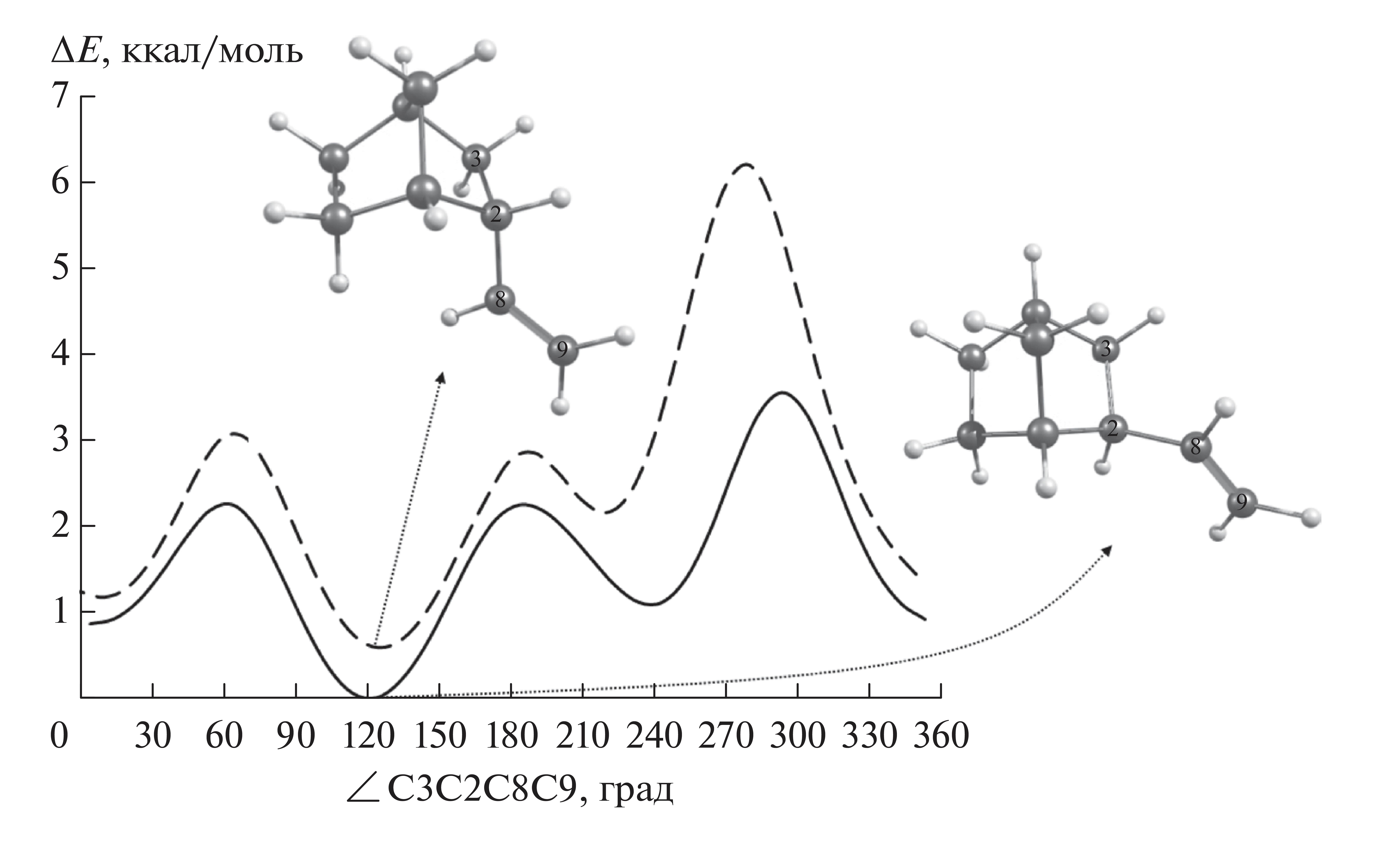 Рис. 2. Потенциальные кривые вращения винильной группы в эндо- (прерывистая линия) и экзо- (сплошная линия) изомерах 2-винилнорборнана.