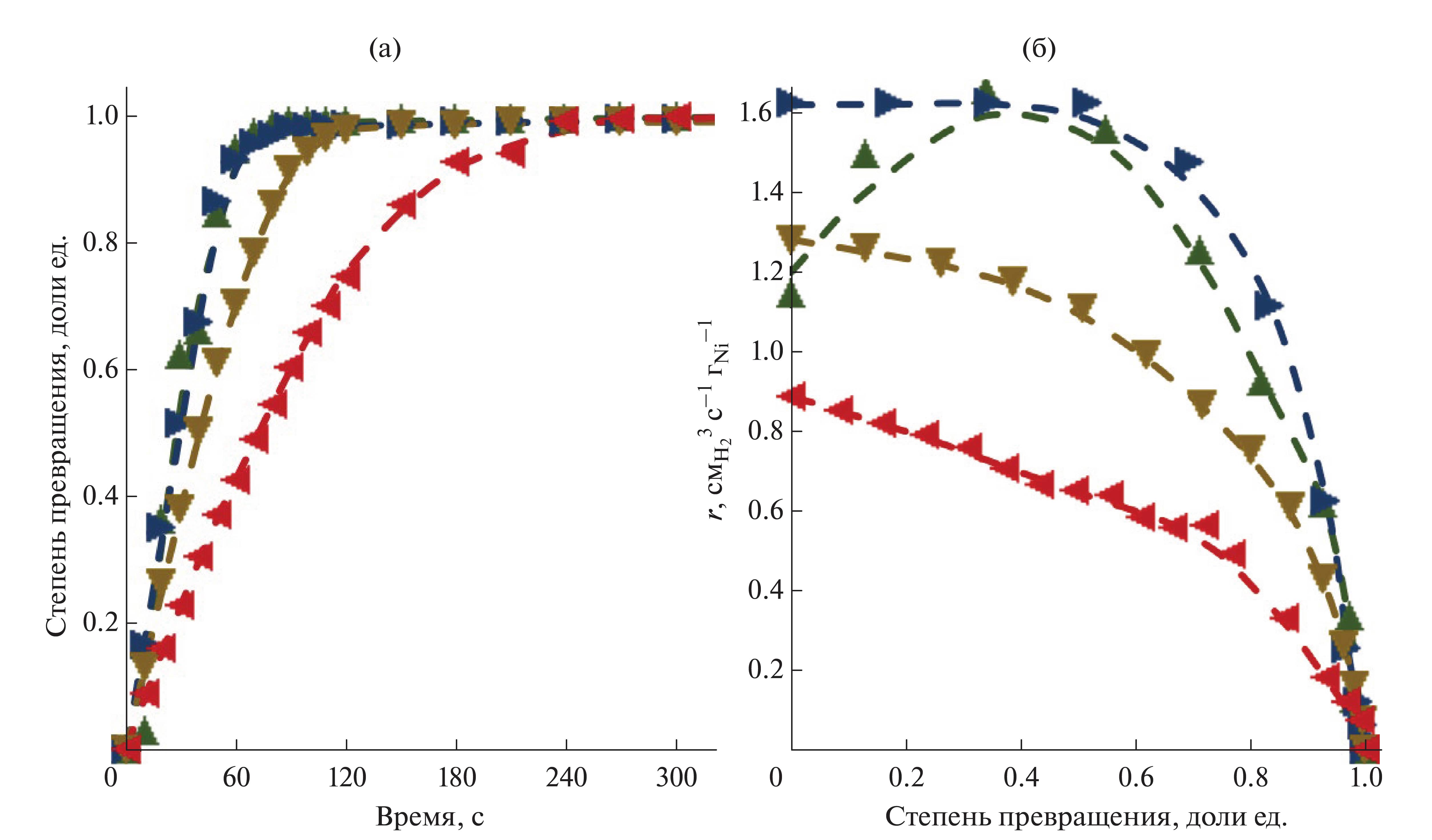 Рис. 2. Зависимости степени превращения от времени реакции (а) и скорости поглощения водорода из газовой фазы от степени его превращения (б) для образца катализатора Ni27.6/SiO2 с различным содержанием сульфида, ммольNa2S/гNi: ▲ – 0, – 0.036, ▼ – 0.109, – 0.217.