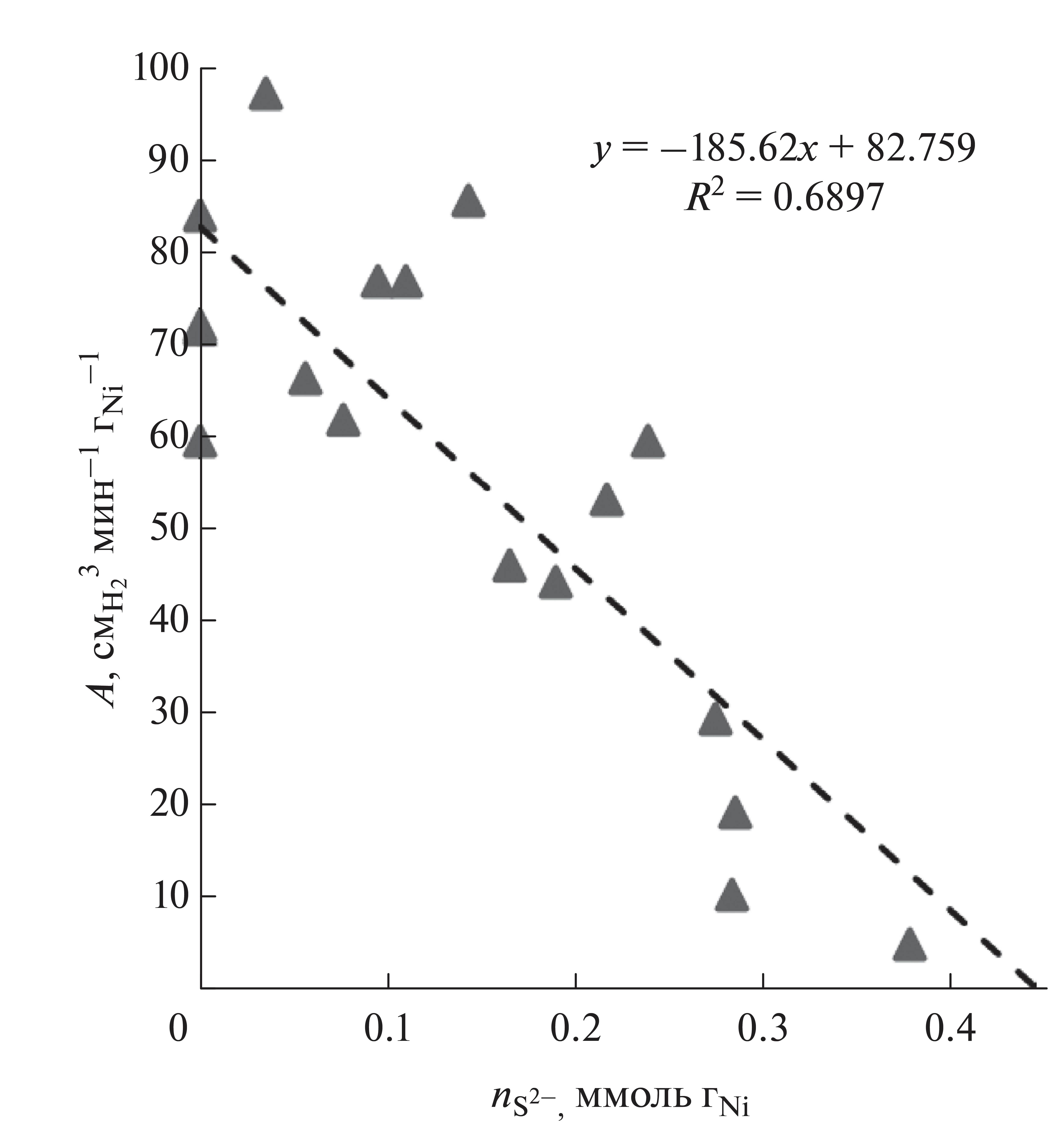 Количество вводимого сульфида выбиралось так, чтобы снизить активность катализатора незначительно, но больше, чем составляет погрешность кинетического эксперимента (10–15%). Таким образом, для каждого катализатора было получено по четыре образца, обработанных разным количеством сульфида.