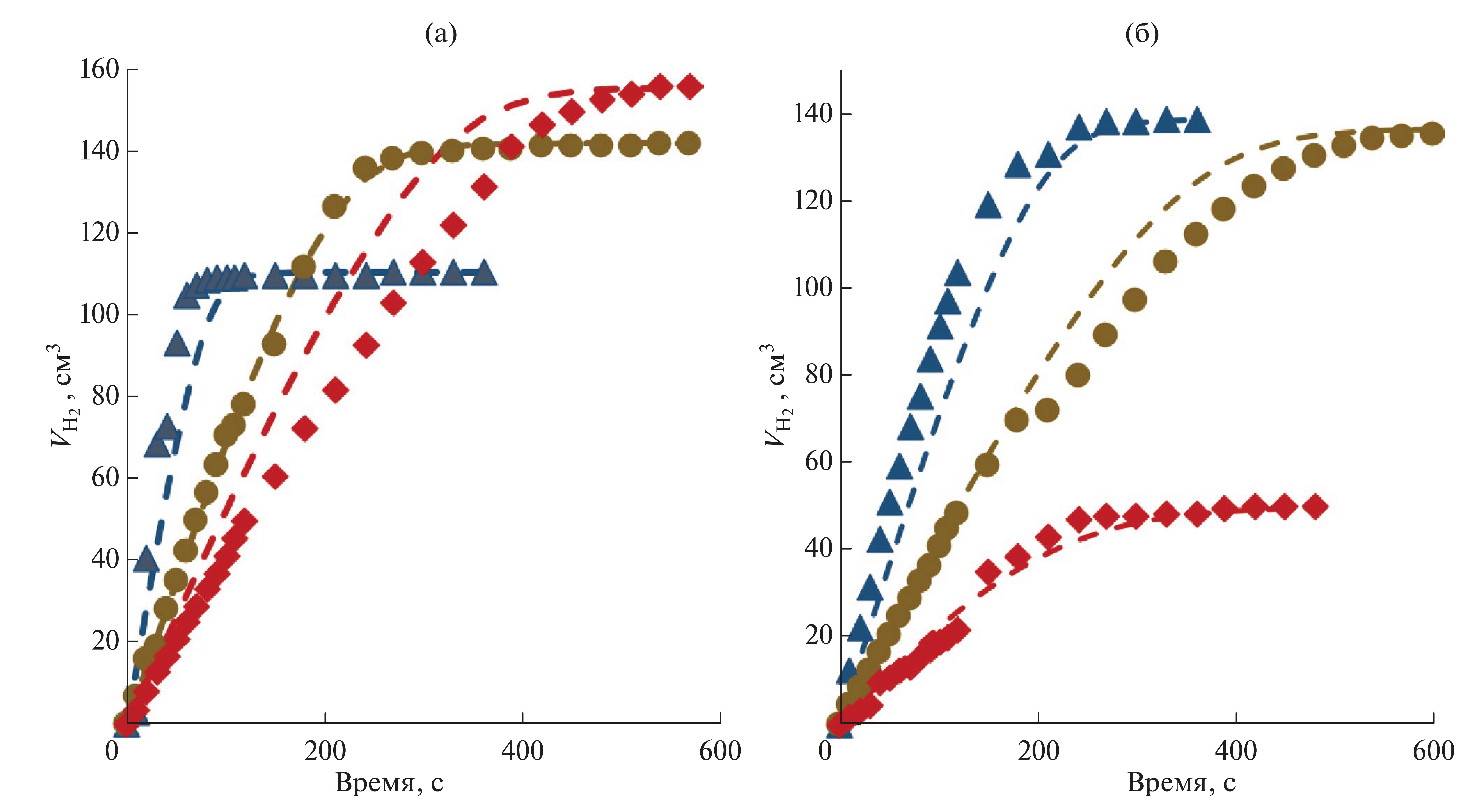 Рис. 4. Кинетические кривые поглощения водорода из газовой фазы для недезактивированных (a) и частично дезактивированных (б) катализаторов с содержанием никеля 27.6 (▲), 20.5 (●) и 9.1 мас. % (♦); точки – эксперимент, линии – расчет.