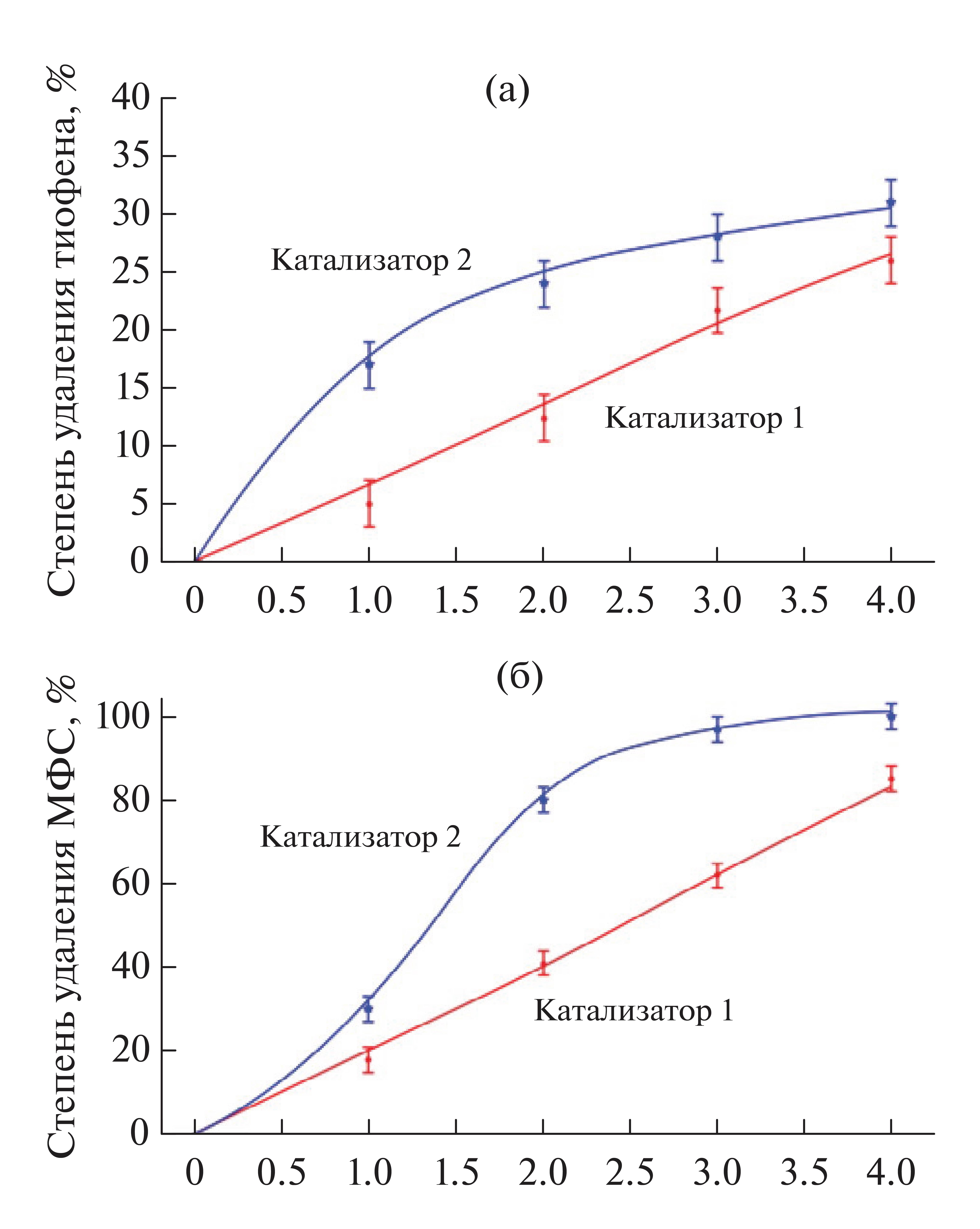 Рис. 3. Зависимость степени удаления тиофена (а) и метилфенилсульфида (б) от времени на разных катализаторах. Условия: 60°С, 5 мл модельного раствора, 0.05 г катализатора, 0.2 мл 50% H2O2.