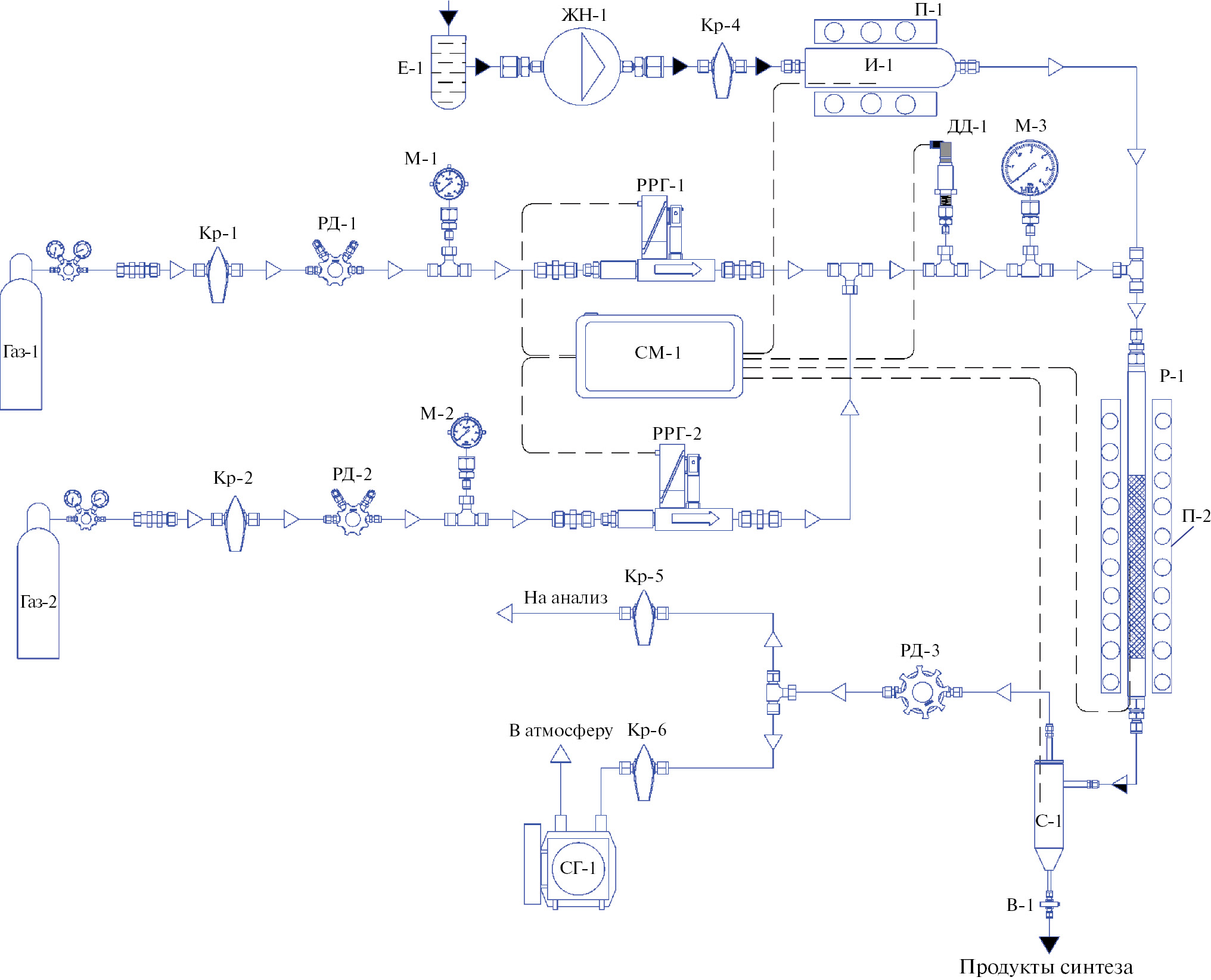 Рис. 1. Схема лабораторной каталитической установки: Е1 – емкость с исходными жидкими компонентами, ЖН-1 – насос жидкостный, Газ-1 – баллон с водородом, Газ-2 – баллон с азотом, Кр-1–Кр-6 – кран шаровый, РД1, РД2 – регулятор давления, М-1, М-2, М-3 – манометр, РРГ-1, РРГ-2 – регулятор расхода газа, ДД-1 – датчик давления, СМ-1 – смеситель, И-1 – испаритель, П-1 – печь испарителя, Р-1 – реактор, П-2 – печь реактора, С-1 – сепаратор, РД-3 – регулятор давления в реакторе, СГ-1 – счетчик газа